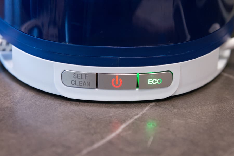 Для кратковременного выброса пара кнопку на утюге следует нажать и отпустить, при необходимости постоянной подачи пара ее следует держать нажатой. Для трехсекундного выброса пара повышенной мощности нажать на кнопку нужно дважды. При нажатии правой кнопки на панели управления включается энергосберегающий режим Эко.