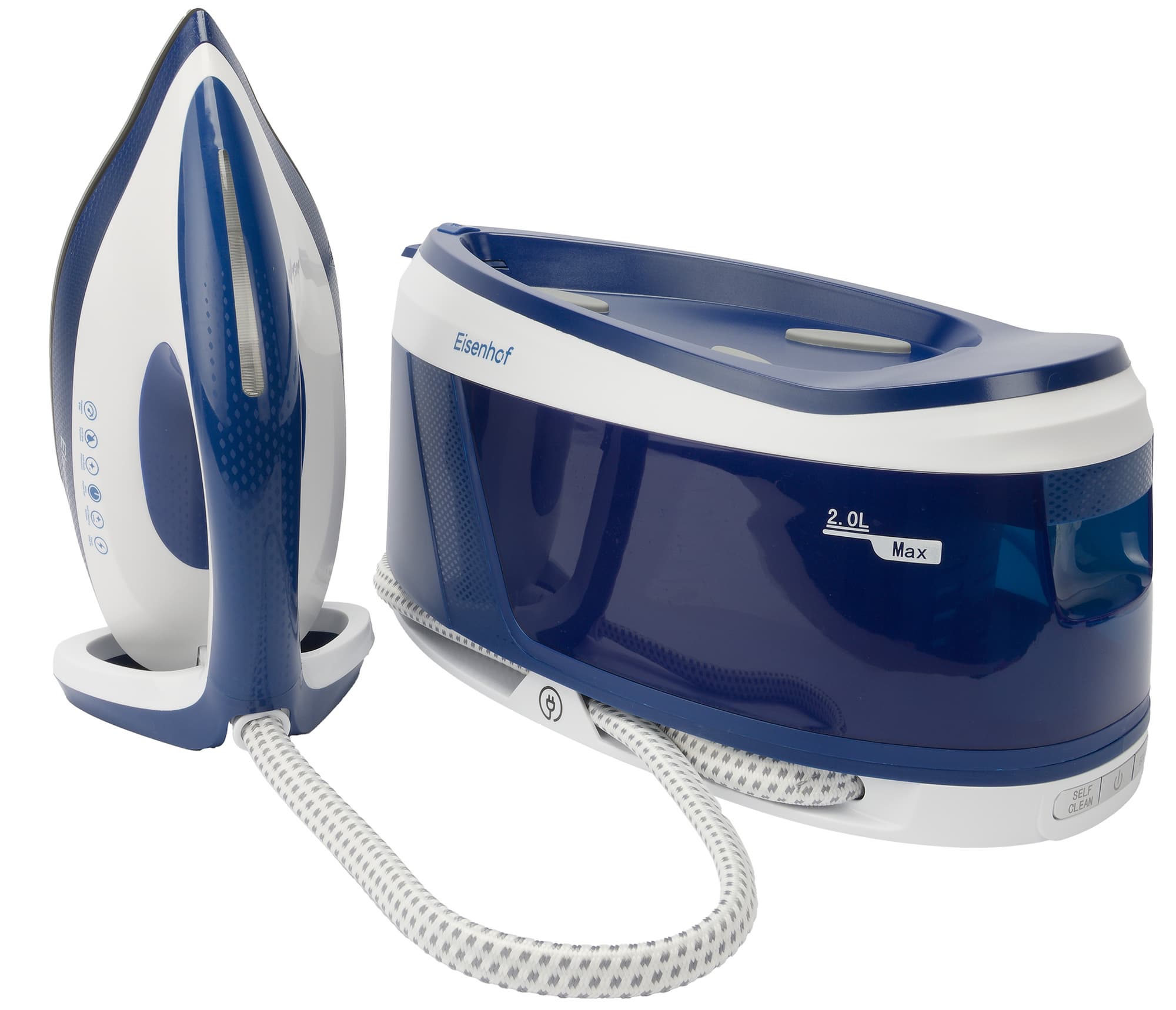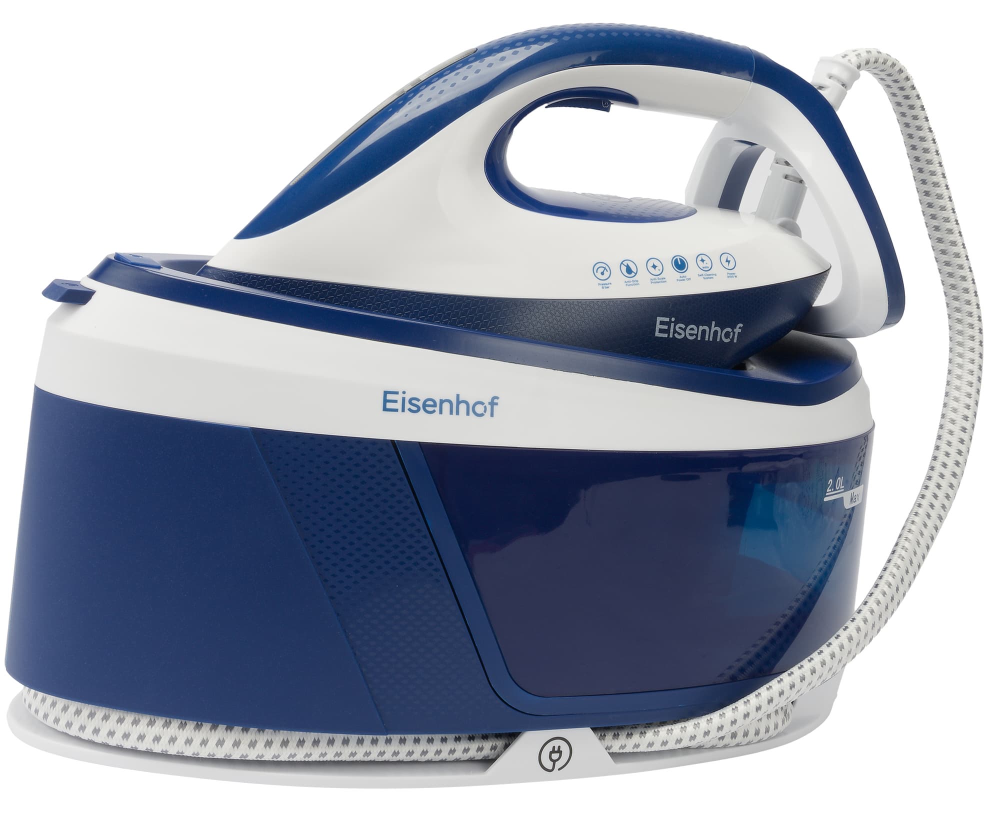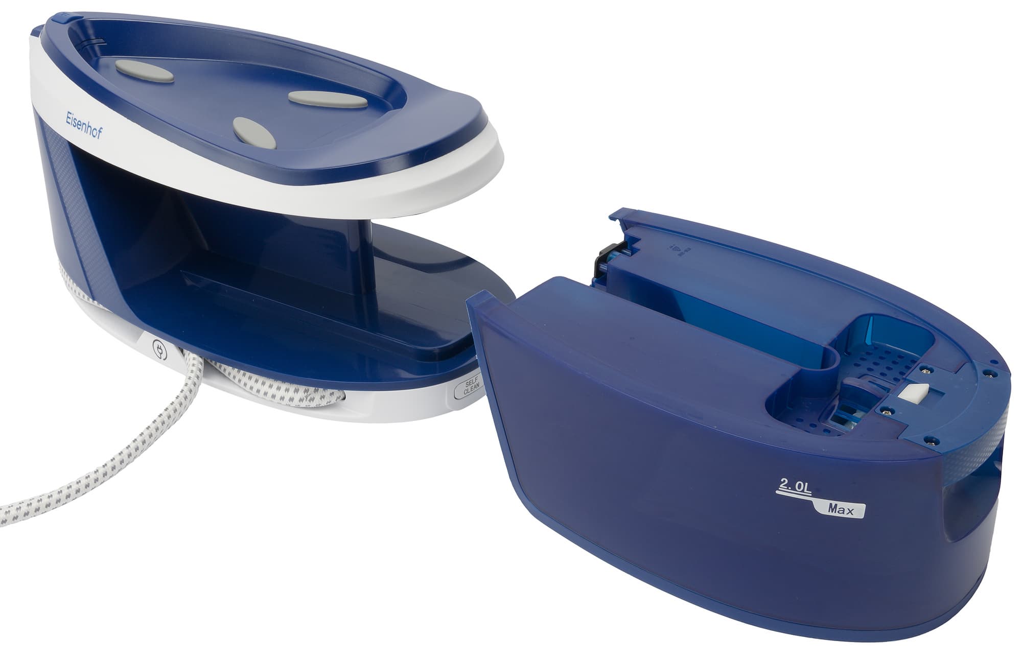 Парогенератор Eisenhof VS300 представляет собой единую конструкцию, состоящую из паровой станции с утюгом, соединенных между собой шлангом подачи пара.