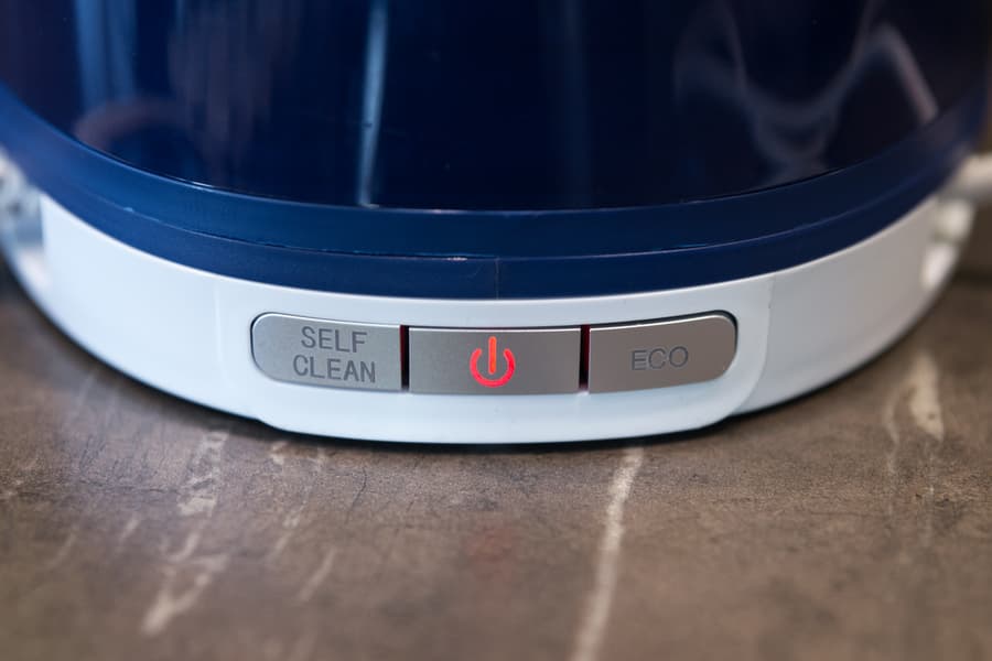 Парогенератор начинает работать на меньшей мощности выпуская уменьшенное количество пара. Левая кнопка запускает режим самоочистки устройства от накипи, в течение которого из отверстий в подошве утюга будет выходить вода.