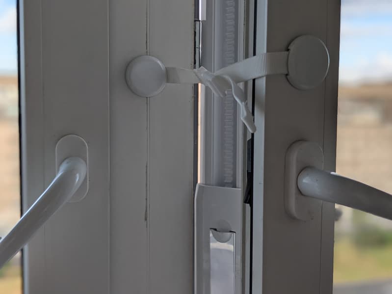 Там же мы обнаружили капроновый ремешок, которые не дает оконной раме самопроизвольно распахиваться. Его можно закрепить на раме при помощи двух шурупов (также в комплекте) или на двусторонний скотч, приклеенный к установочным площадкам.