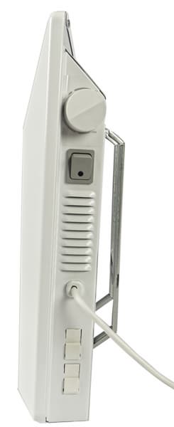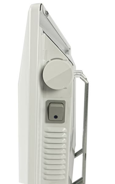 Справа — панель управления, состоящая из механической ручки и клавиши со светодиодным индикатором. Под ними расположена решетка, направленная вниз (предположительно, для забора воздуха извне с целью обеспечения дополнительного охлаждения элементов панели управления). Ещё ниже из корпуса выведен шнур питания.
