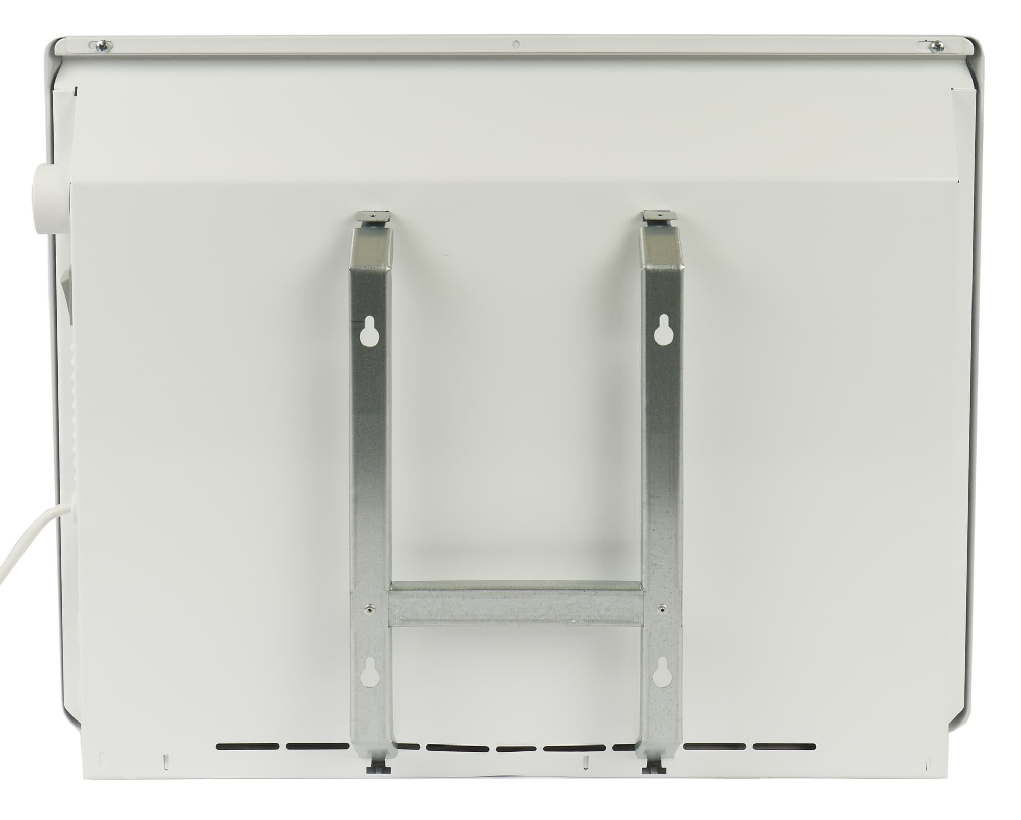 С тыльной стороны мы также видим корпус из окрашенного металлического листа и настенное крепление (кронштейн). Сразу же обращаем внимание на то, что ножек у данной модели в комплекте не имеется, а следовательно поставить обогреватель на пол не получится. Ножки, конечно, можно докупить отдельно, однако целесообразность подобного решения вызывает некоторые вопросы — неужели две пластиковые ножки настолько существенно влияют на цену устройства, что производитель решил освободить нас от лишних расходов? В общем, нужно быть готовым к тому, чтобы заказать комплект опор (350-400 рублей) и отправиться за ними в ближайший пункт выдачи покупок.