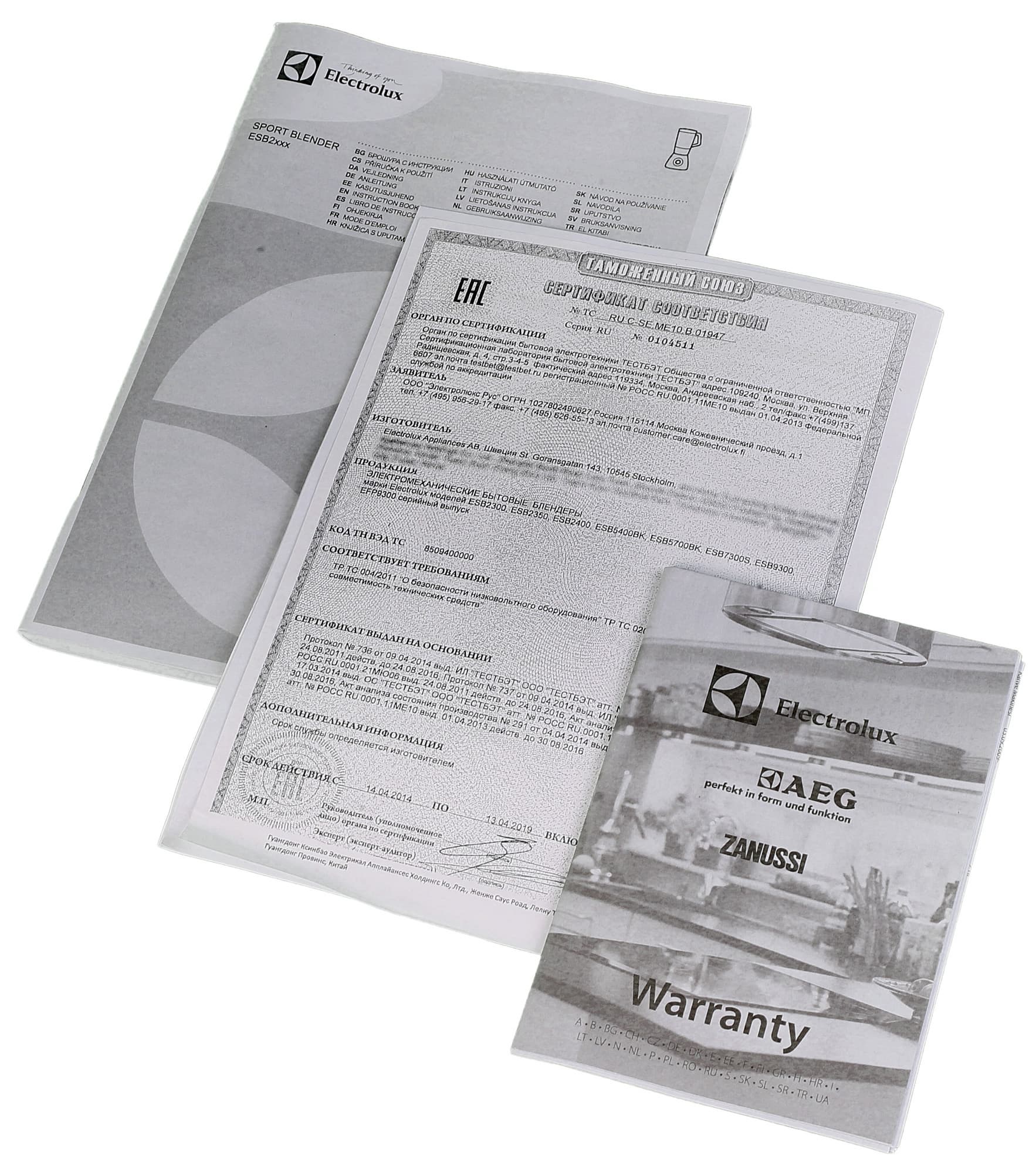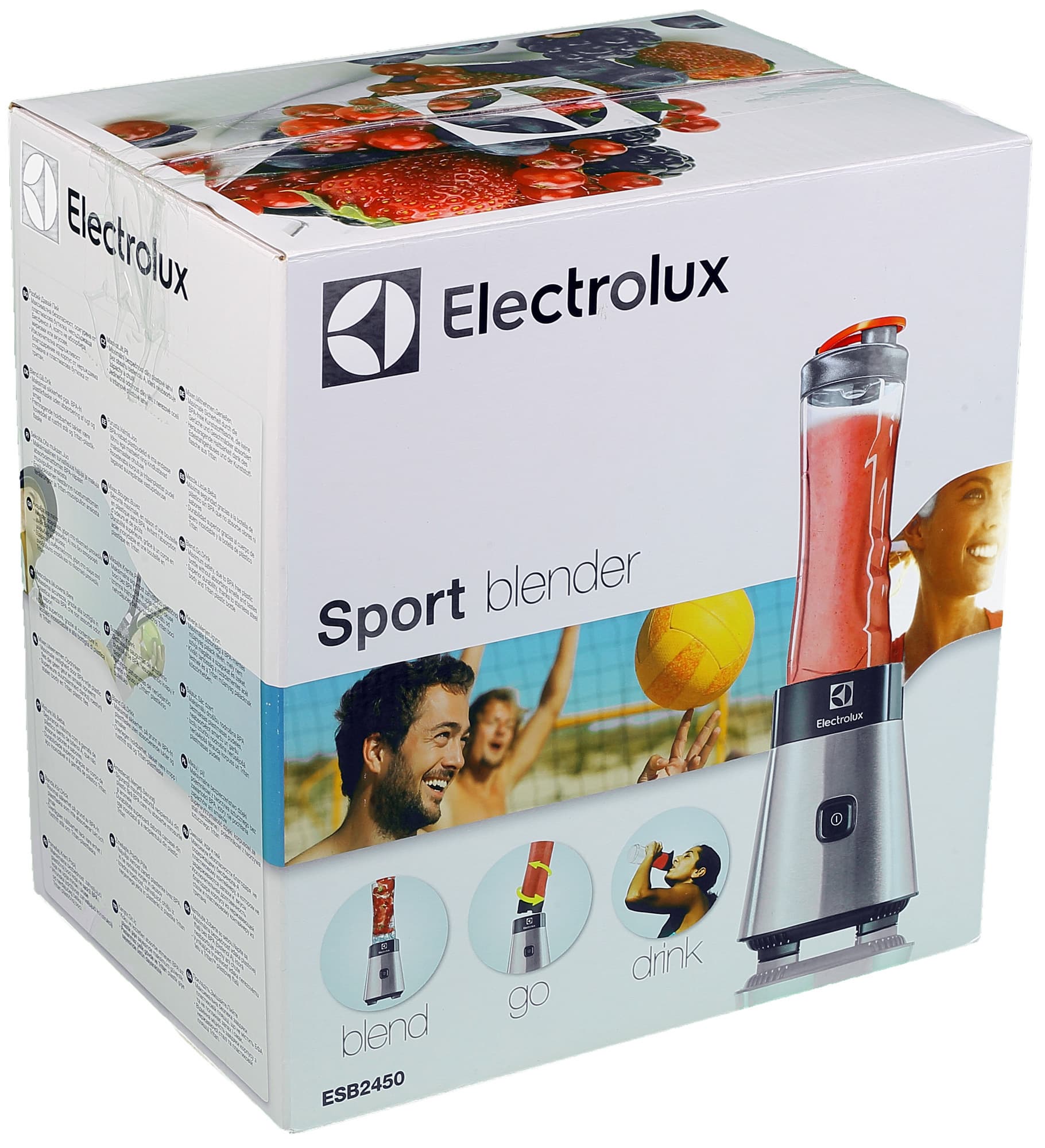 Аккуратная белая картонная коробка привлекает внимание яркими сочными ягодами и изображением блендера с чашей, полной смузи предположительно из этих ягод. Компания Electrolux прямо заявляет модель как «спортивный блендер» и рисует на коробке девушку-спортсменку и слоган «мешай — иди — пей» (blend — go — drink). Коробка проклеена скотчем по швам и за счет маленьких размеров прекрасно обходится без ручки для переноски. Внутри все комплектующие плотно упакованы и зафиксированы картонными вставками.