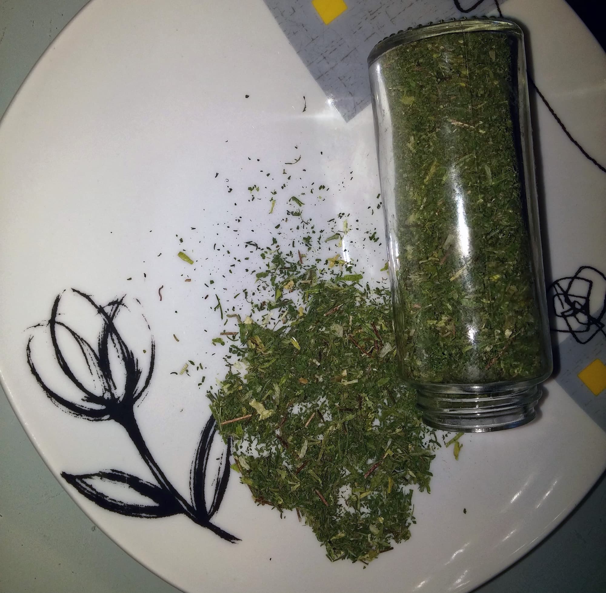 Набор разнообразной зелени также прошел через дегидратор и за полминуты превратился с помощью блендера в мелко перемолотые петрушку, укроп и зеленый лук и чуть более крупно смолотые чабрец и мяту (виной тому веточки чабреца).