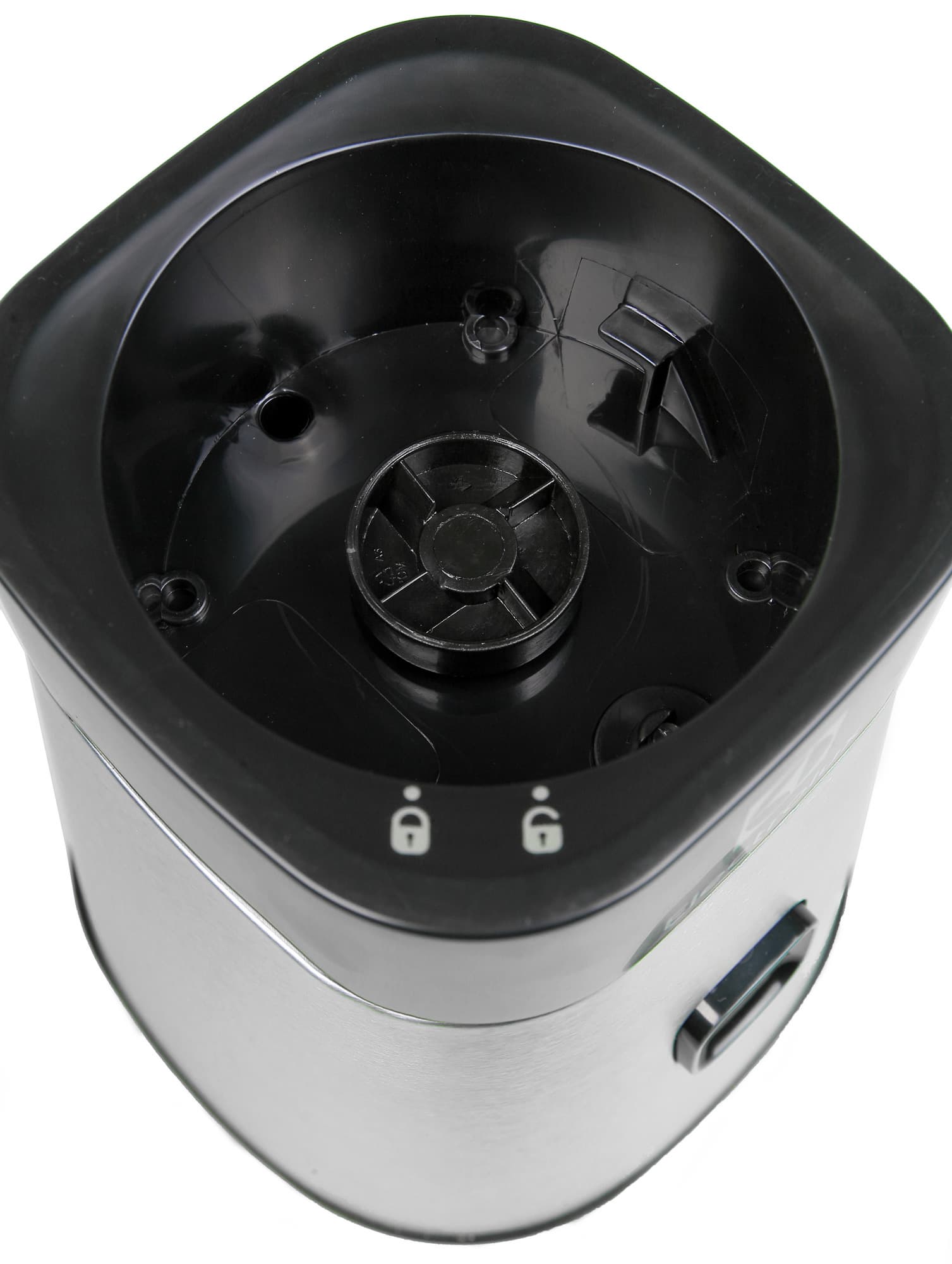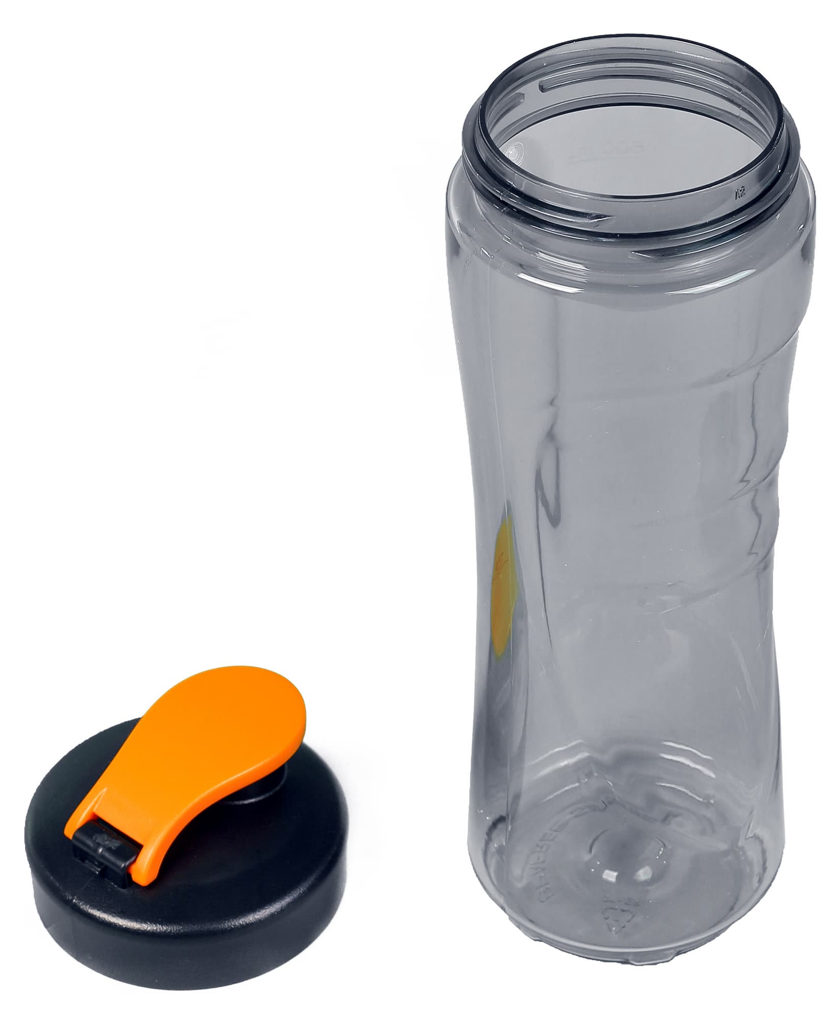 Корпус блендера выглядит привычно для категории: сочетание стали и матового черного пластика, плавно сужающаяся кверху форма, утопленная квадратная кнопка управления посередине. Пластиковая чаша на 600 мл, по сути узкая и высокая бутылка, придает прибору в сборке немного космический вид. Герметичная крышка с отверстием для питья легко навинчивается на бутылку, оранжевый клапан создает яркий акцент, бутылку удобно держать в руке за счет небольшой «талии» посередине.