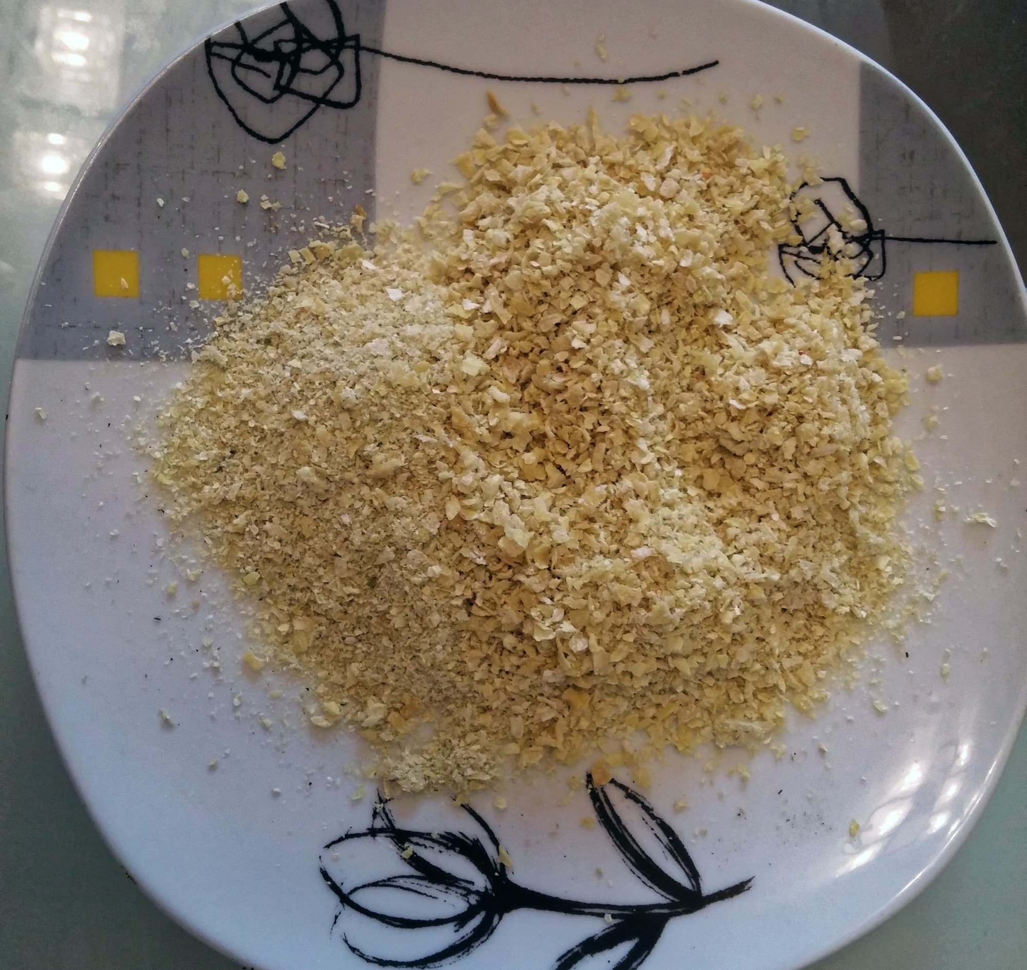 После тестирования электросушилки у нас остался сушеный лук, мелко нашинкованный и порезанный кольцами. За минуту работы с перерывами блендер превратил его в удобную в использовании приправу с разной степенью помола: кольца лука превратились в мелкие кусочки, а резаный сушеный лук — практически в порошок.