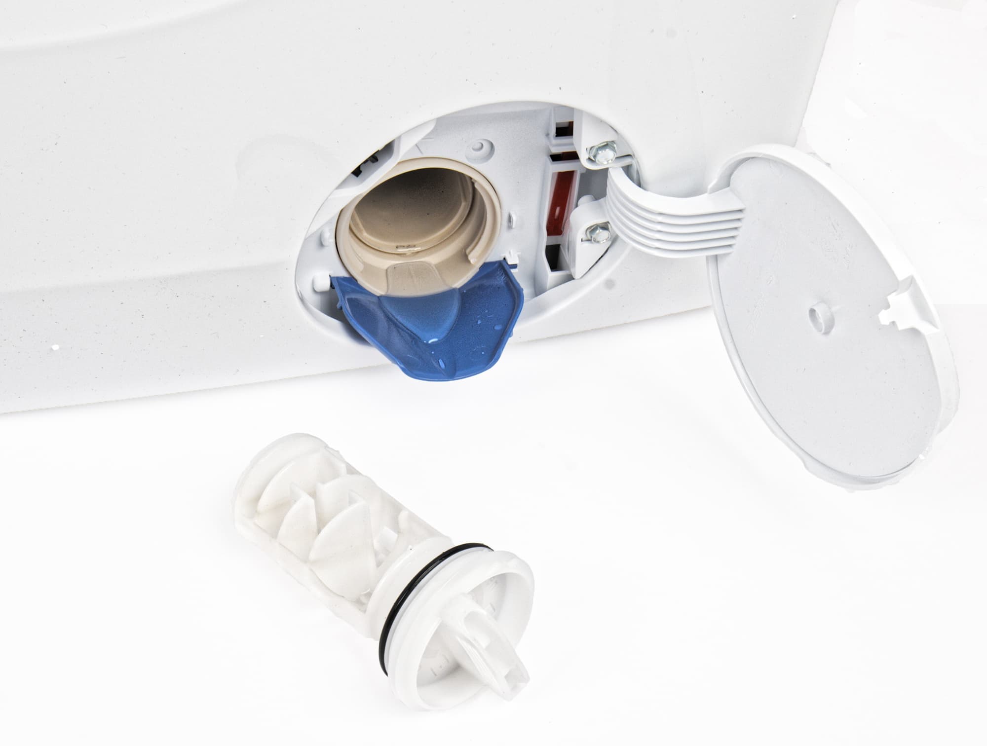 Круглый лючок выпускного фильтра привычно расположен снизу справа на передней панели. Он снабжен откидным пластиковым козырьком, который направляет стекающую при открытии пробки воду в подставленную емкость. Это очень удобная мелочь.