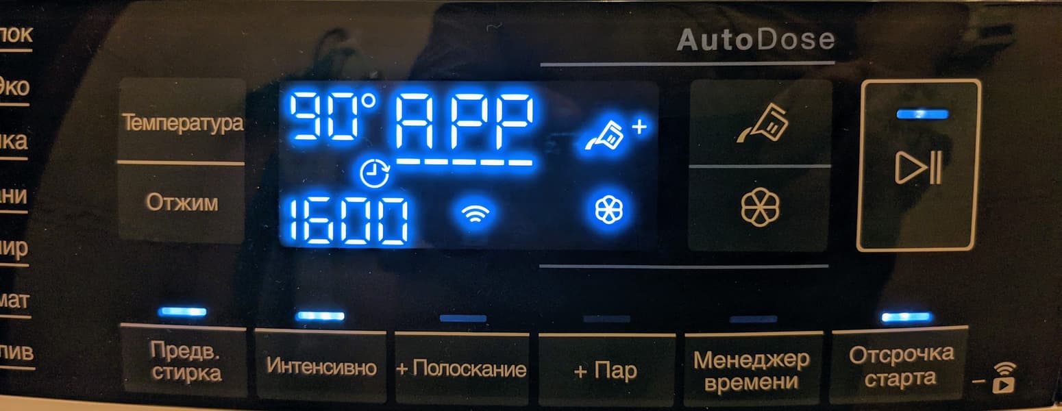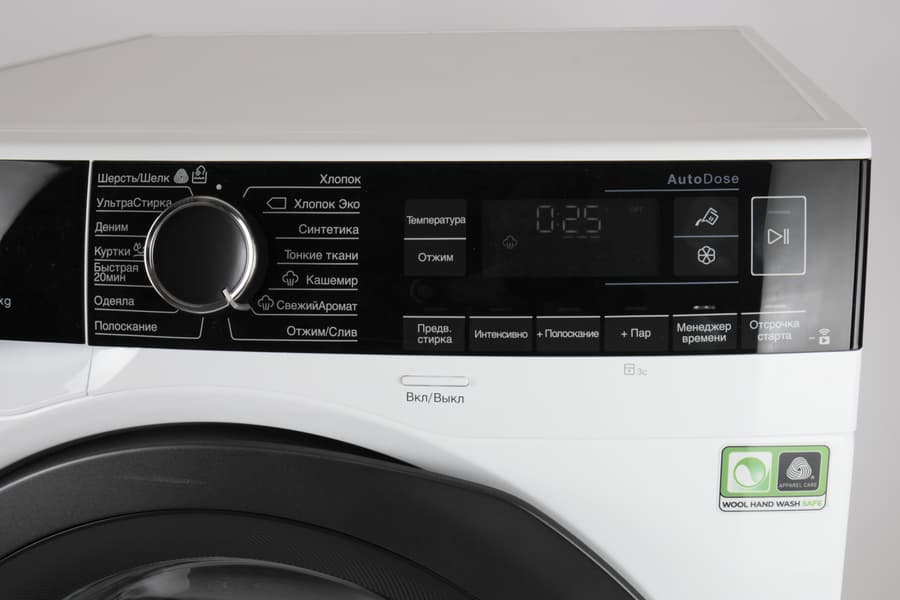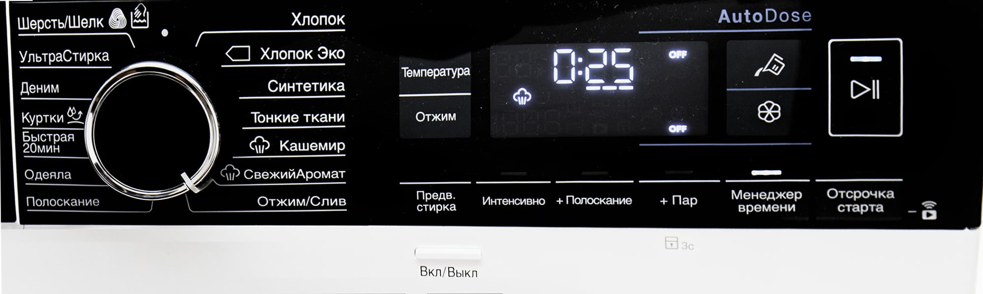 Слева от дисплея находятся кнопки, которые управляют температурой стирки и скоростью отжима, а справа — блок индикаторов и кнопок для функции AutoDose. Нажав на нужные из них, можно увеличить расход моющего средства или кондиционера для текущей программы или, наоборот, поставить функцию AutoDose на паузу, переключив лоток на ручную подачу моющих средств.