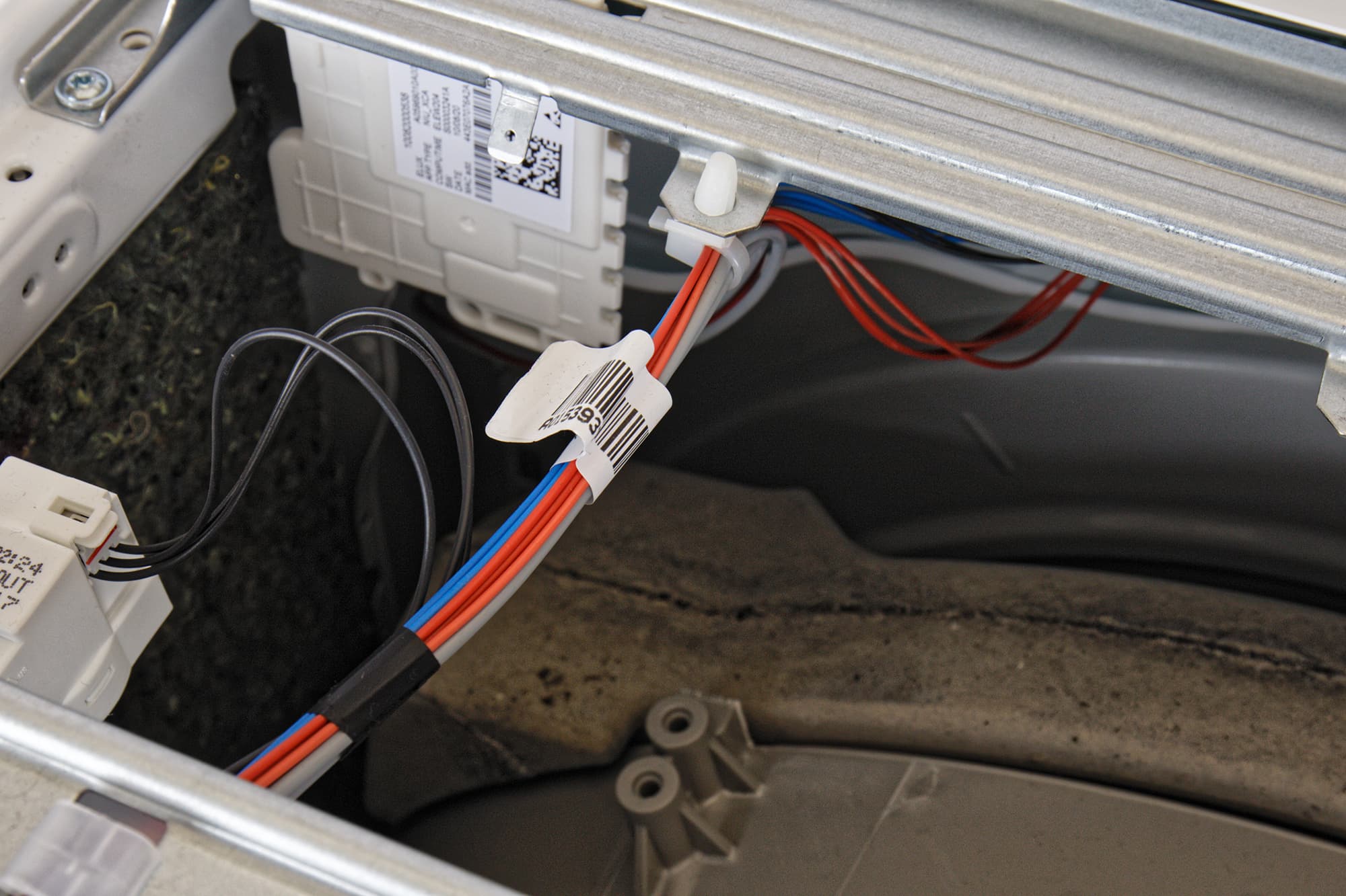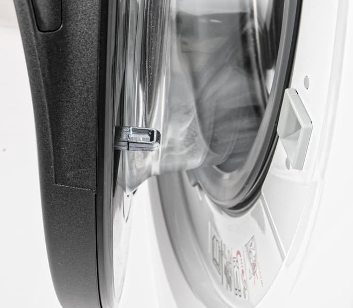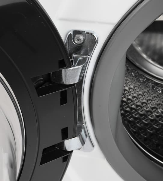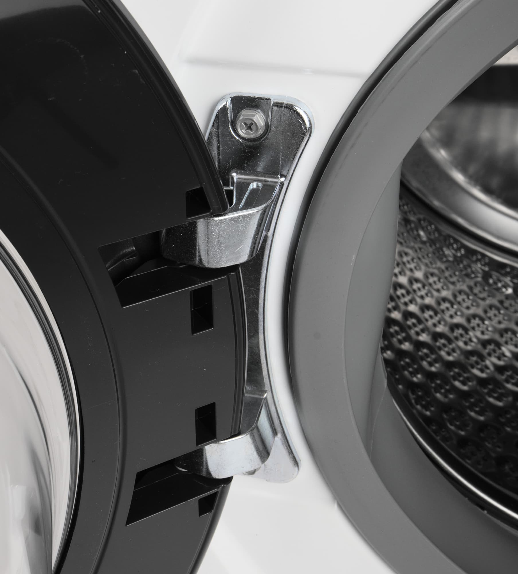 Крышка барабана подвешена на металлических петлях, так что ее легко снять, если машина не проходит в слишком узкий дверной проем или дверь пассажирского лифта. А это вполне может случиться: обрамление барабана чуть выступает за максимальный габарит корпуса. Потом крышку так же легко поставить на место, когда последний сложный проем остался позади.