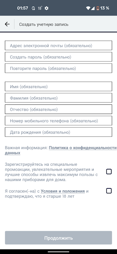 Для регистрации русскоязычная версия приложения требует верифицированный адрес электронной почты, номер мобильного телефона, имя, фамилию, отчество пользователя и дату его рождения. Все поля, включая отчество, обязательны для заполнения.