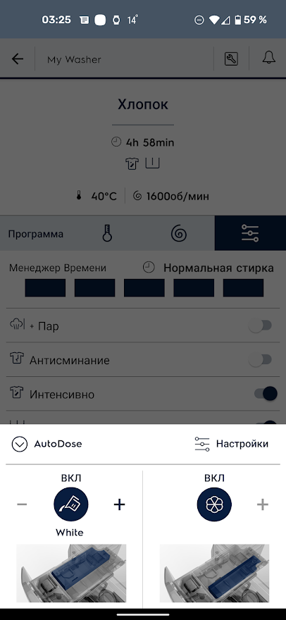 На этот раз мы использовали программу для хлопка с увеличенной до 95 °C температурой и включенным режимом интенсивной стирки. Изменили мы и настройки AutoDose, повысив расход моющего средства до 100 мл.
