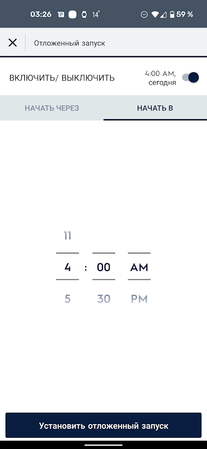 Начало работы можно отложить с помощью кнопки «Отсрочка» старта: от 1 до 23 часов с шагом в 1 час.