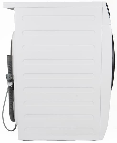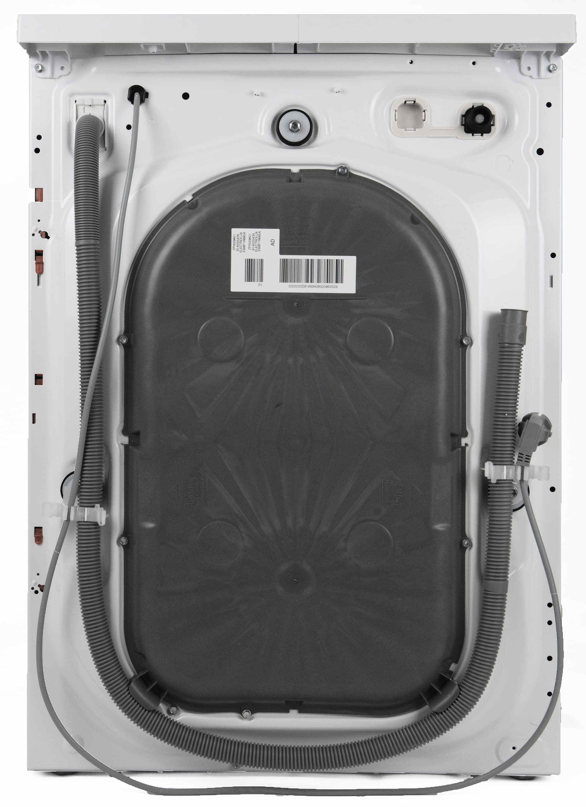 Задняя стенка выглядит привычно: привод барабана закрыт кожухом, сверху разъем для подключения заливного шланга, крепление для электрошнура, сам шнур и сливной шланг.