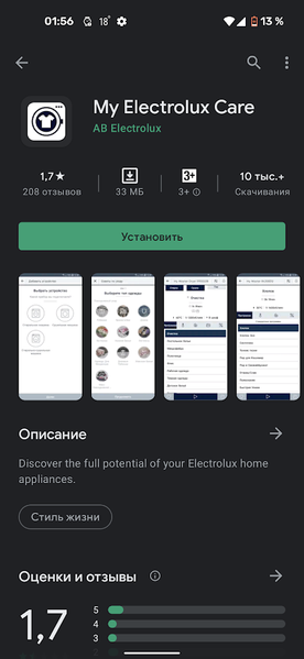 Для управления стиральной машиной производитель предлагает приложение My Electrolux Care (свыше 10 тысяч скачиваний со средней оценкой 1,7 на момент написания обзора).