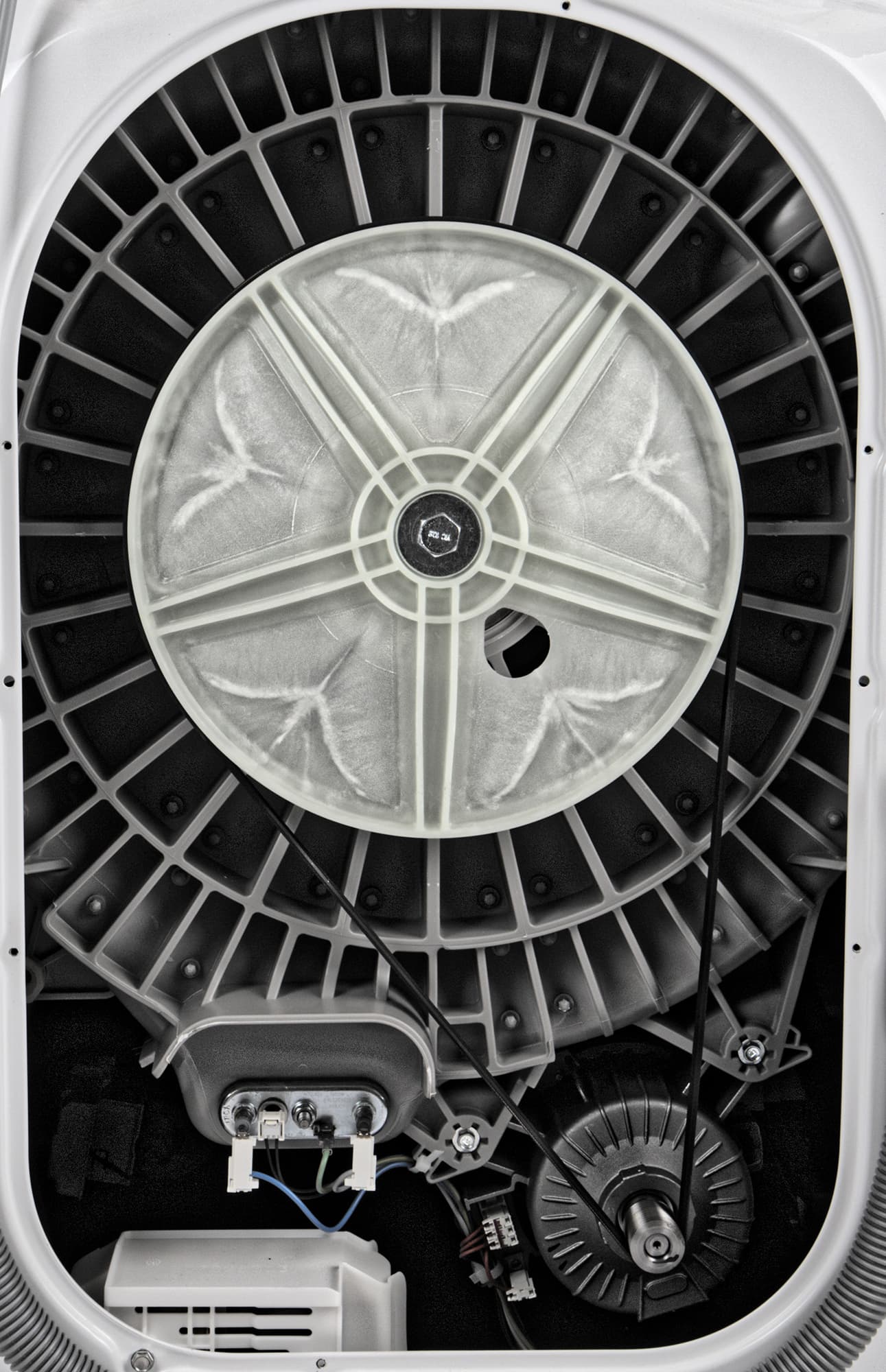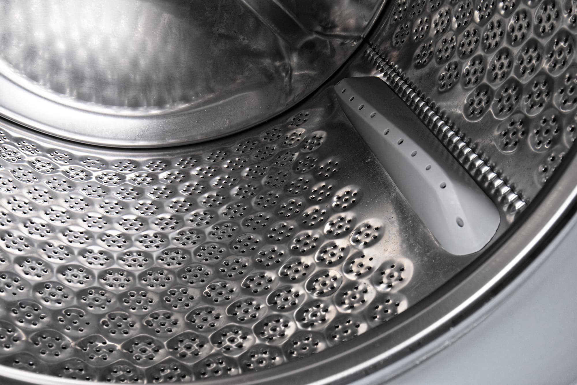 Неразборный барабан из нержавеющей стали изнутри покрыт перфорацией, по структуре напоминающей соты: группы по семь отверстий в каждой (все мы не проверяли, но в видимых именно так) расположены внутри круглых выштамповок. Серые пластиковые бойники, способствующие перемешиванию белья, слегка изогнуты.