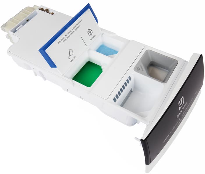 Конструкция лотка у этой модели отличается от привычной уже при первом знакомстве. Там, помимо традиционных емкостей для загрузки разовых порций средств для стирки и ополаскивания, есть еще дополнительные резервуары.