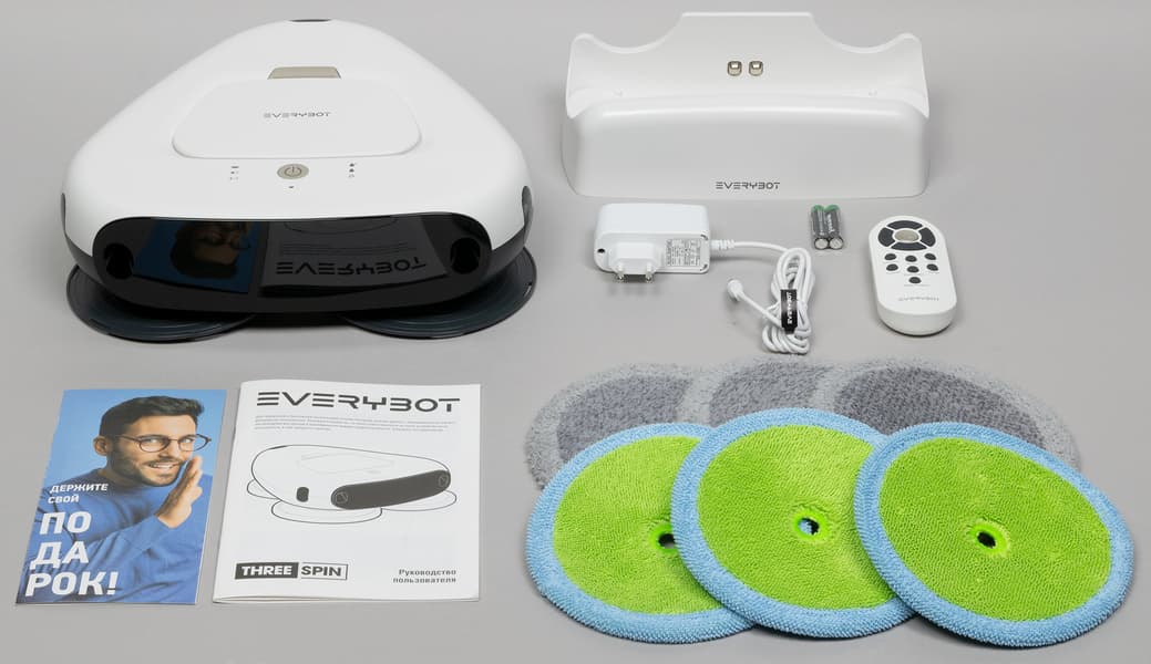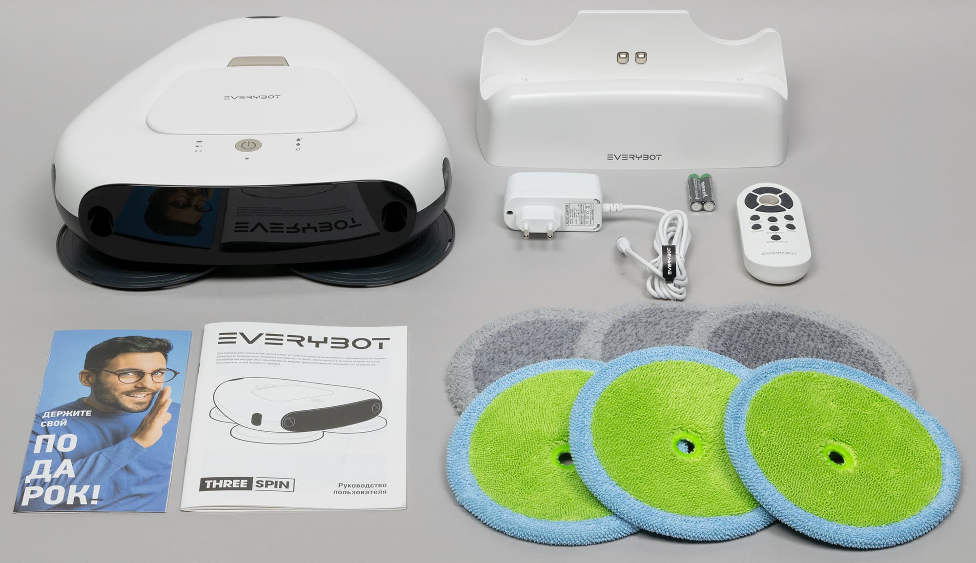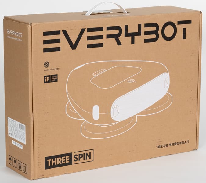 Робот-полотер Everybot Three Spin поставляется в фирменной коробке из гофрированного картона. На лицевой стороне упаковки схематически изображено само устройство, крупным шрифтом напечатан логотип компании, ниже — название модели. На боковых гранях есть наклейки на русском языке с техническими характеристиками прибора и информацией о производителе. Упаковка оснащена пластиковой ручкой для переноски.