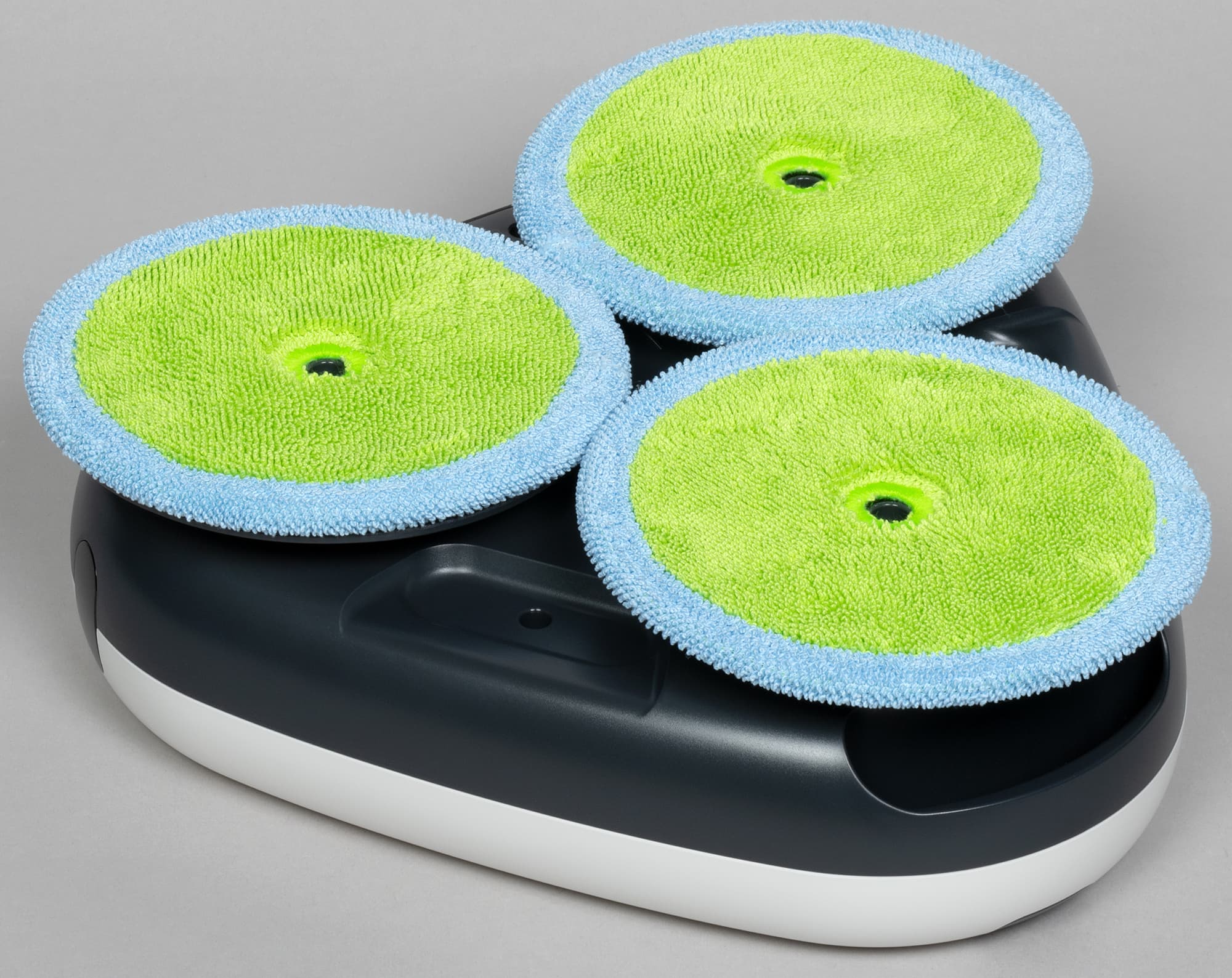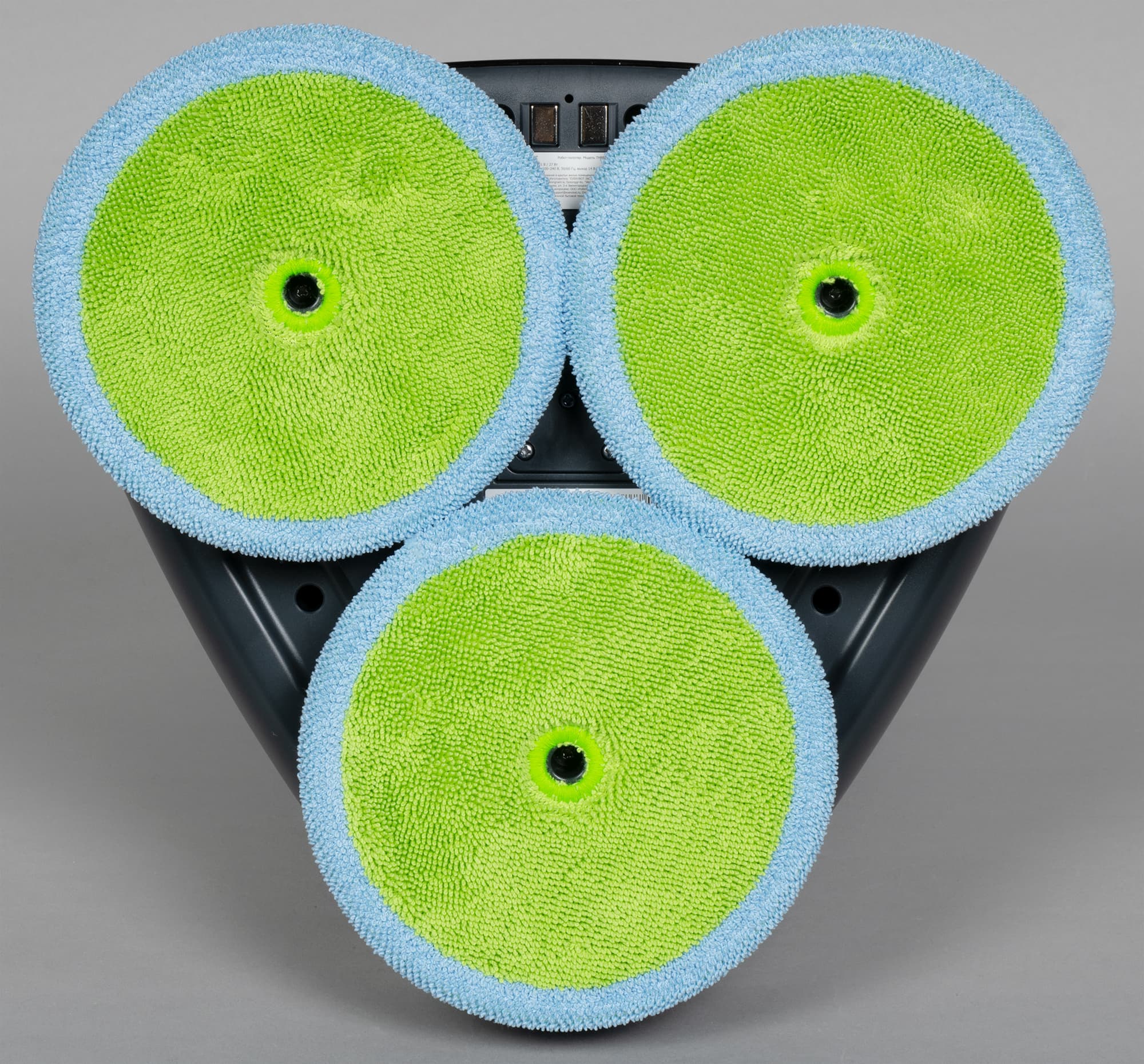 Если пол перед использованием Everybot Three Spin пропылесосили тщательно, то разводов после мытья не останется. Также робот отлично справляется с полировкой пола. Для этого мы устанавливали цветные салфетки, смачивали их специальной жидкостью с маслами, разбрызгивали из пульверизатора ту же жидкость прямо на пол и включали режим локальной уборки по спирали, Focus.