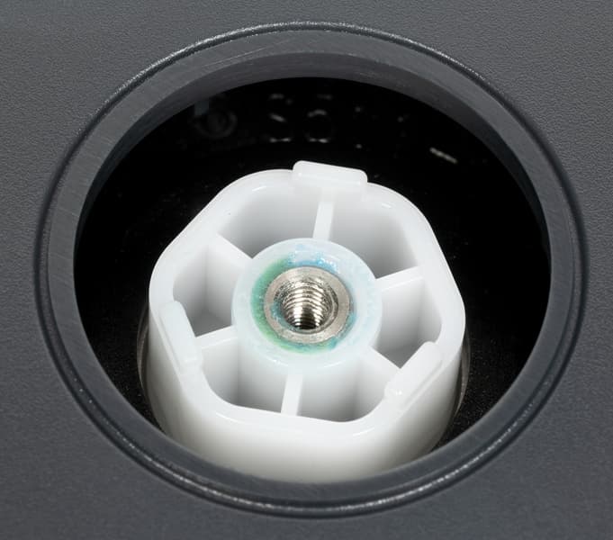 Посередине верхней панели расположено гнездо установки резервуара для воды. В углублении отсека есть резиновая шайба с водяным фильтром. Детали съемные.