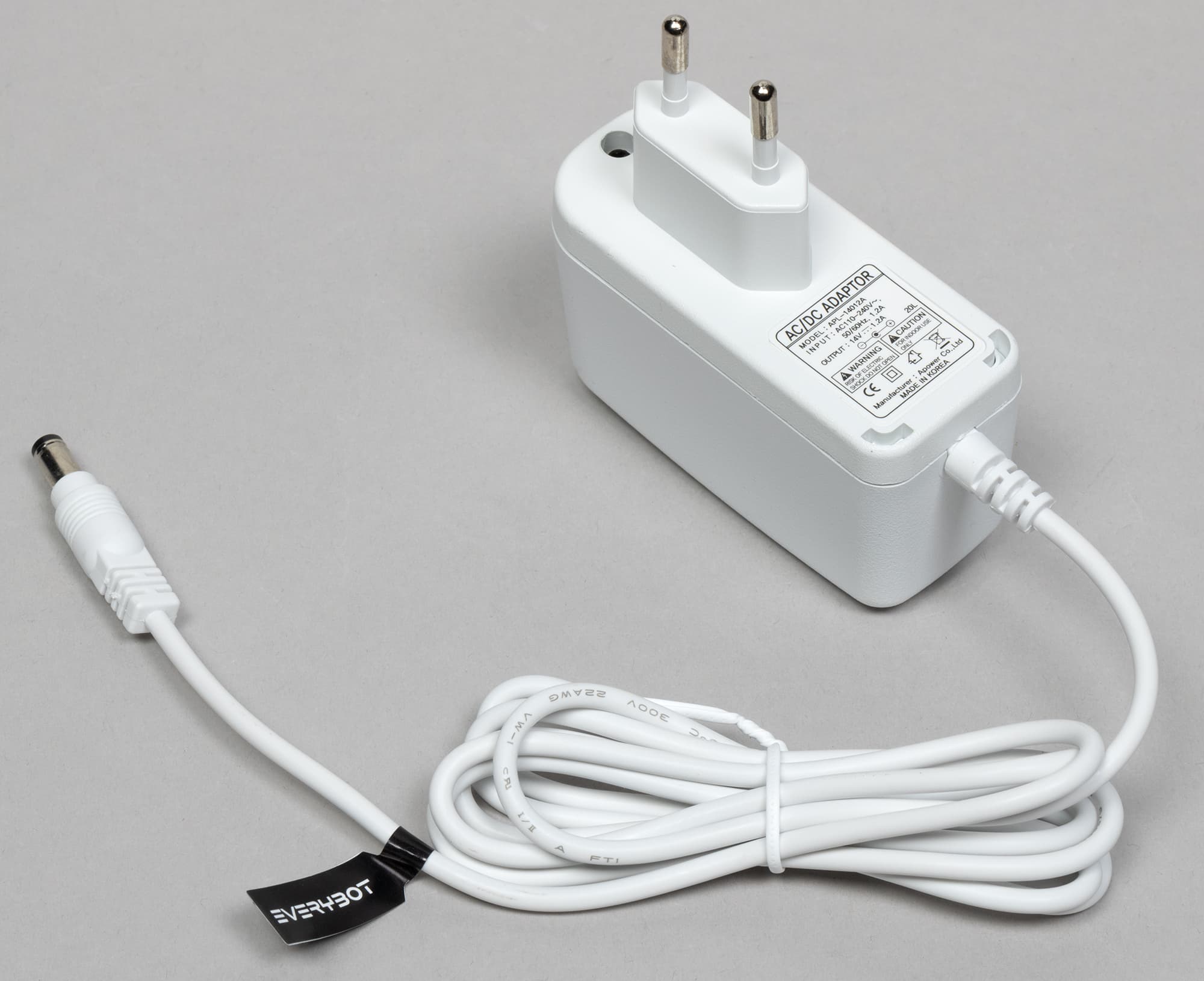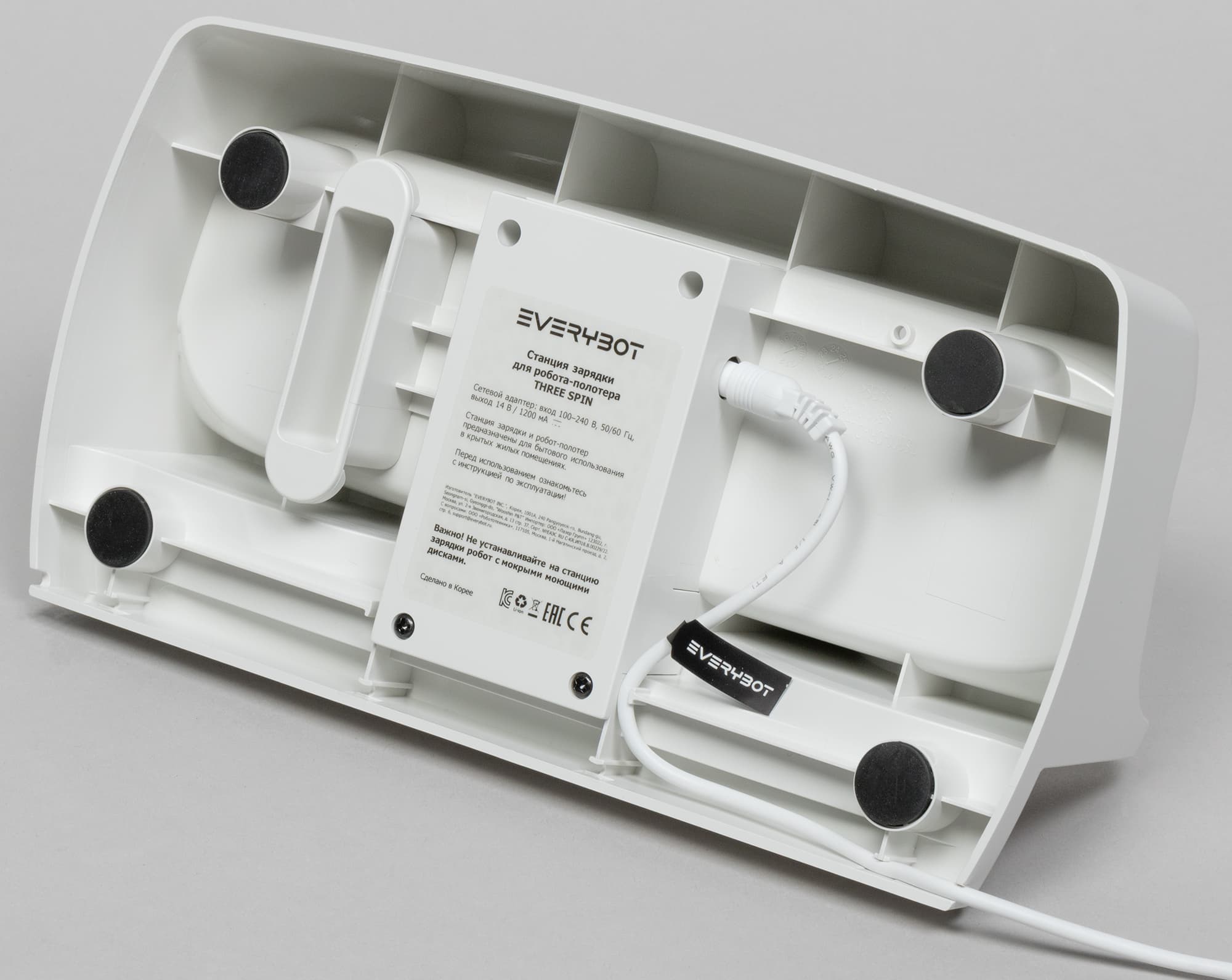 Благодаря четырем прорезиненным ножкам на дне станции конструкция одинаково устойчиво держится на поверхности, как с установленным роботом, так и без него. С обратной стороны помимо ножек находится разъем для подключения шнура блока питания и наклейка с технической информацией.