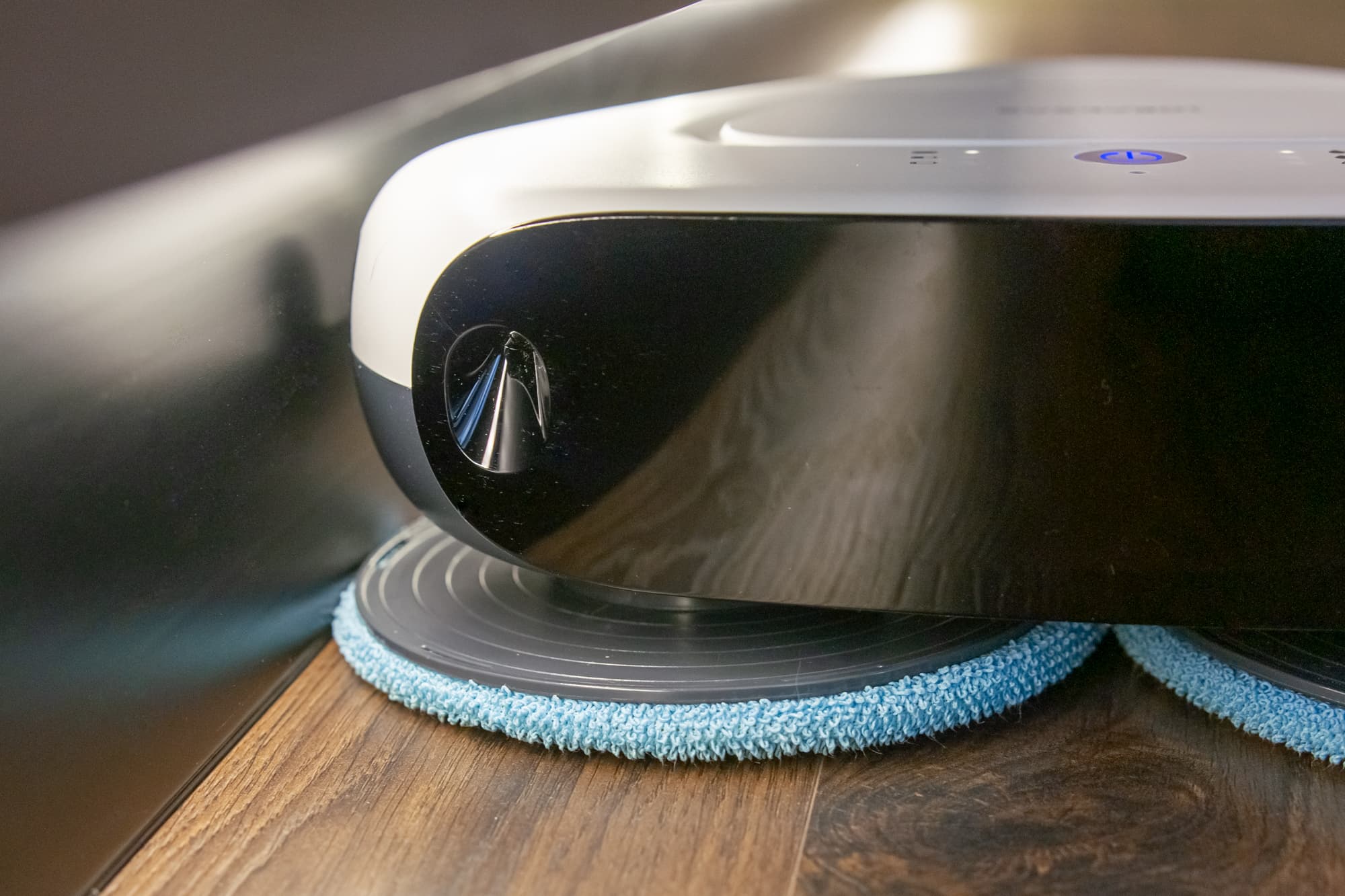 Во фронтальной части устройства и по краям, за черными глянцевыми вставками из пластика установлены датчики поверхности и определения препятствий на пути робота. Всего в бампере, по словам производителя, установлено 11 инфракрасных датчиков. В числе прочих есть и датчики глубины, определяющие перепад высоты пола, которые не позволят роботу упасть с лестницы.