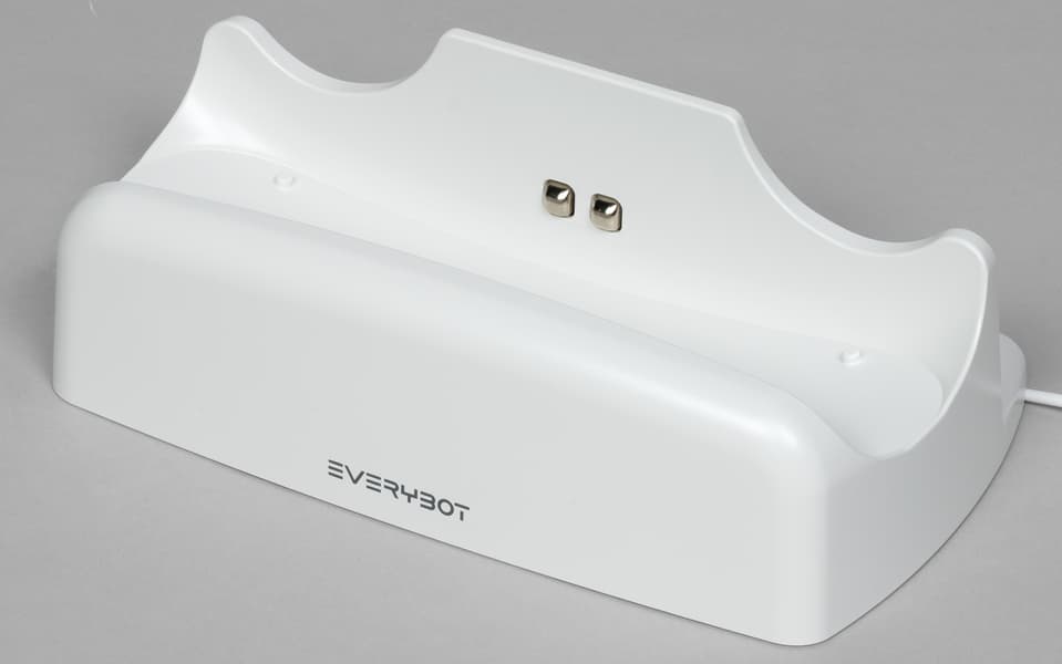 Робот заряжается в вертикальном положении. При установке робота на зарядку металлические пластинки на дне корпуса совмещаются с контактами на станции.