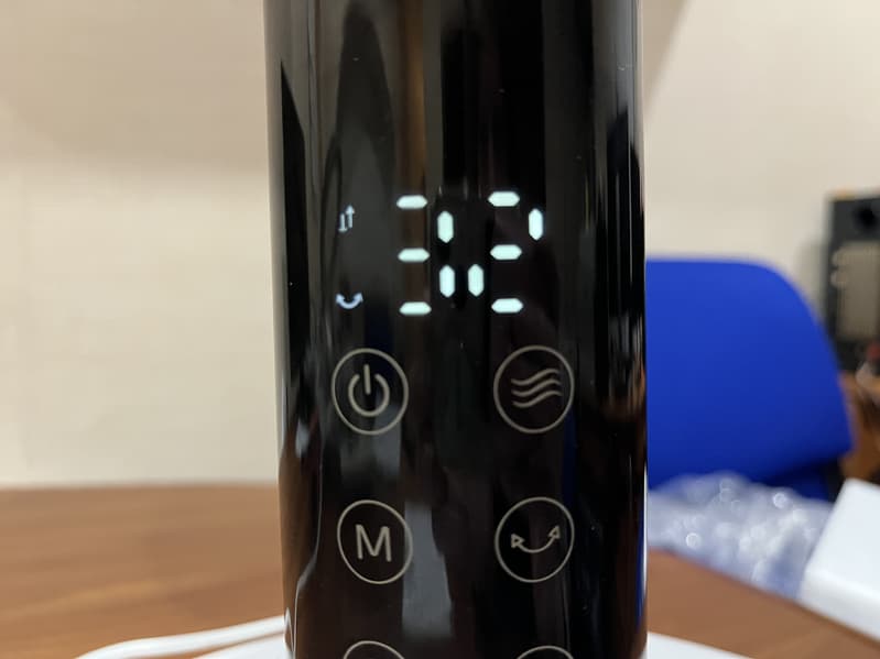 «Автоматический» режим здесь спрятан под кнопкой «AI». При нажатии на эту кнопку, на дисплее загорается индикатор температуры (°C) и заданное по умолчанию значение — 20 градусов. С помощью кнопок «+» и «−» можно установить желаемое значение от 20 до 30 °C. Вентилятор начнет работать мощнее или слабее в зависимости от текущей температуры и будет постоянно регулировать мощность в дальнейшем, пока используется данная функция.