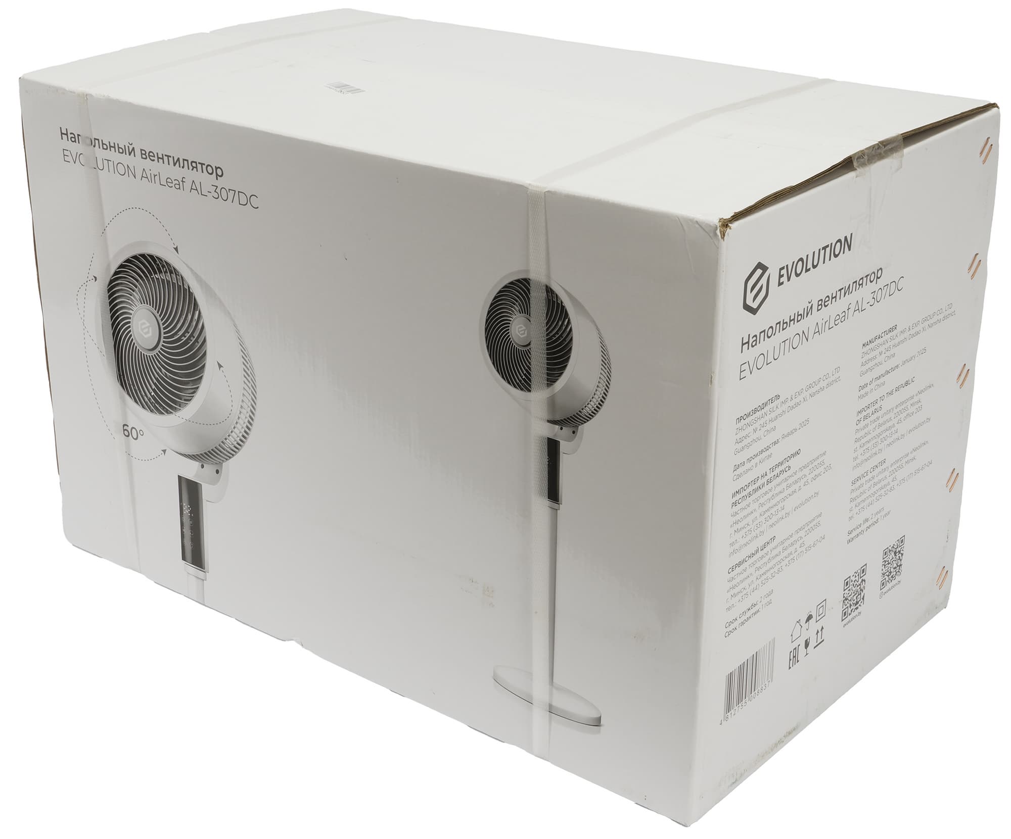 Вентилятор поставляется в довольно крупной коробке в форме параллелепипеда из белого глянцевого картона с цветной печатью. На лицевой стороне упаковки размещены качественные фотографии вентилятора и наименование модели.