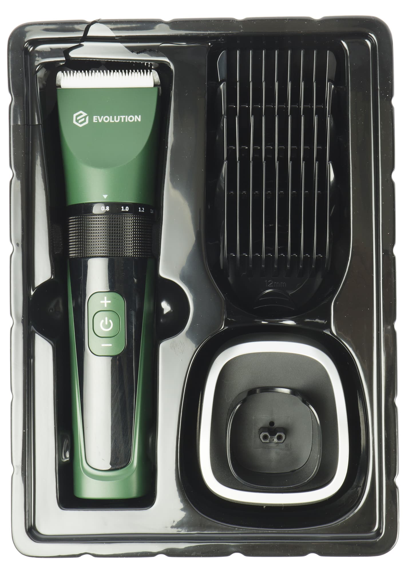 На лицевой стороне мы видим логотип Evolution, под ним — кольцо регулировки длины стрижки при работе без гребней, еще ниже — блок из трех кнопок, а под ним за затемненным пластиком прячется светодиодный дисплей, отображающий состояние прибора и уровень заряда аккумулятора.