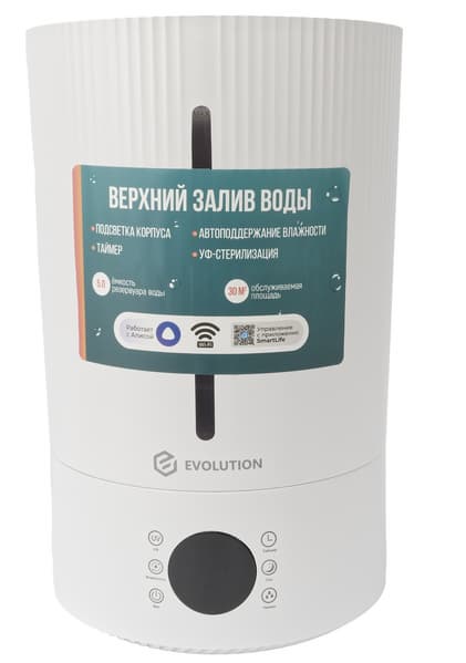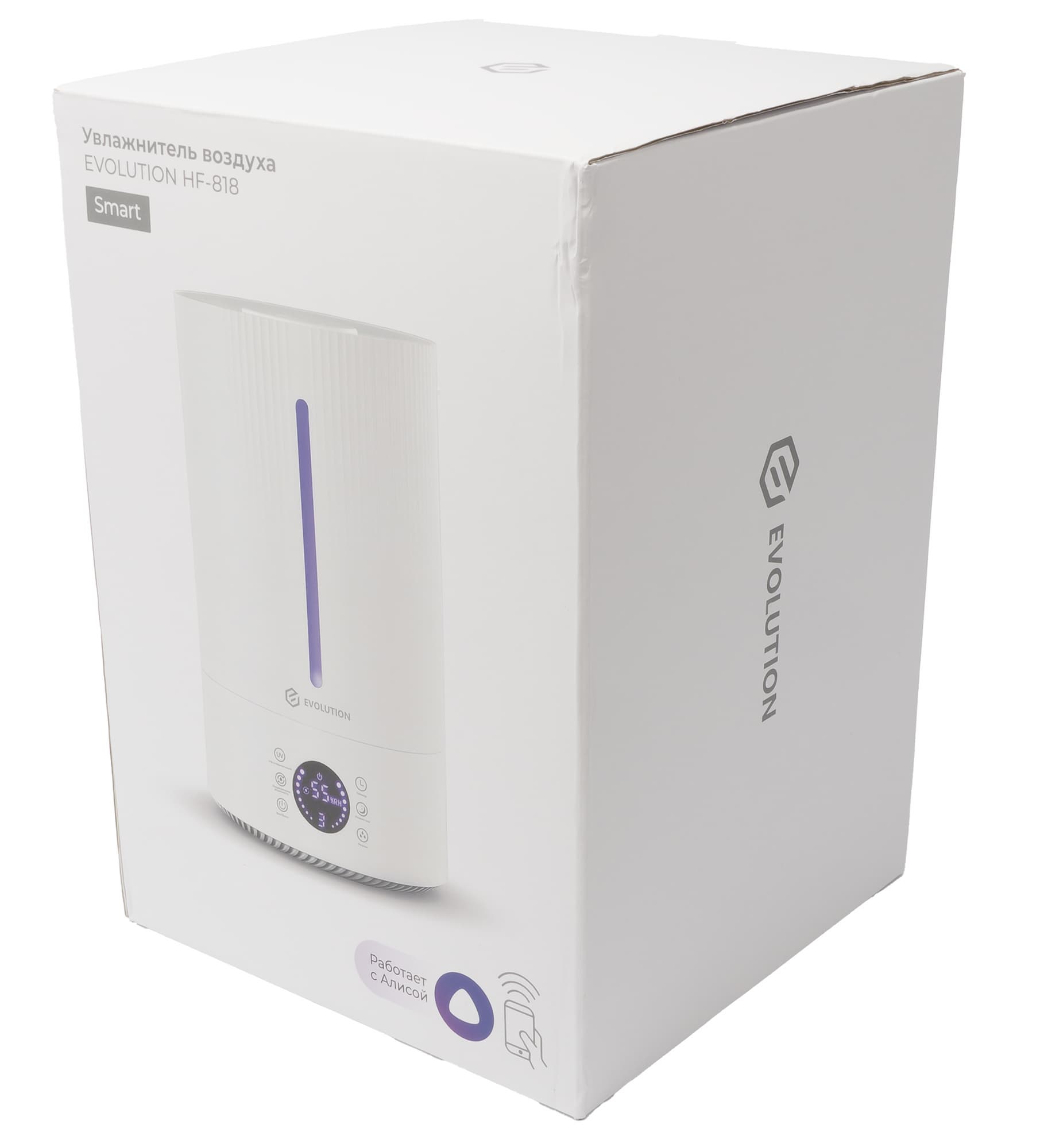 Увлажнитель поставляется в традиционной для Evolution белой картонной коробке.На лицевой стороне мы видим изображение устройства, под которым производитель упоминает о возможности дистанционного управления с помощью Алисы «Яндекса».