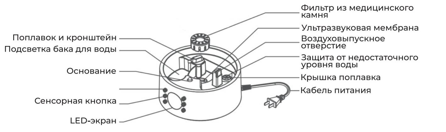 Принцип действия увлажнителя основан на образовании водного тумана на мембране под действием ультразвука. Вода с помощью поплавка дозированно подается на мембрану из резервуара.