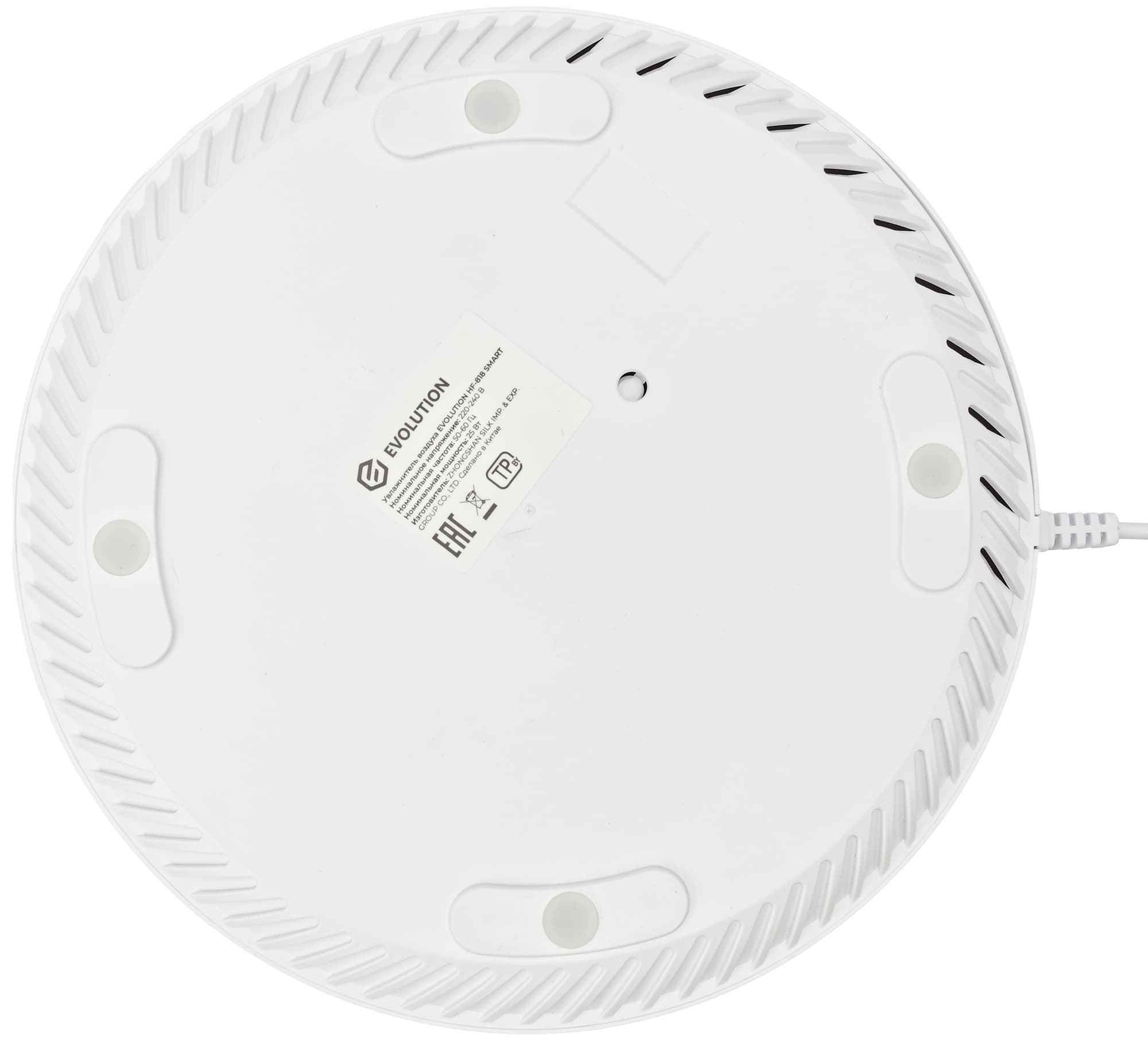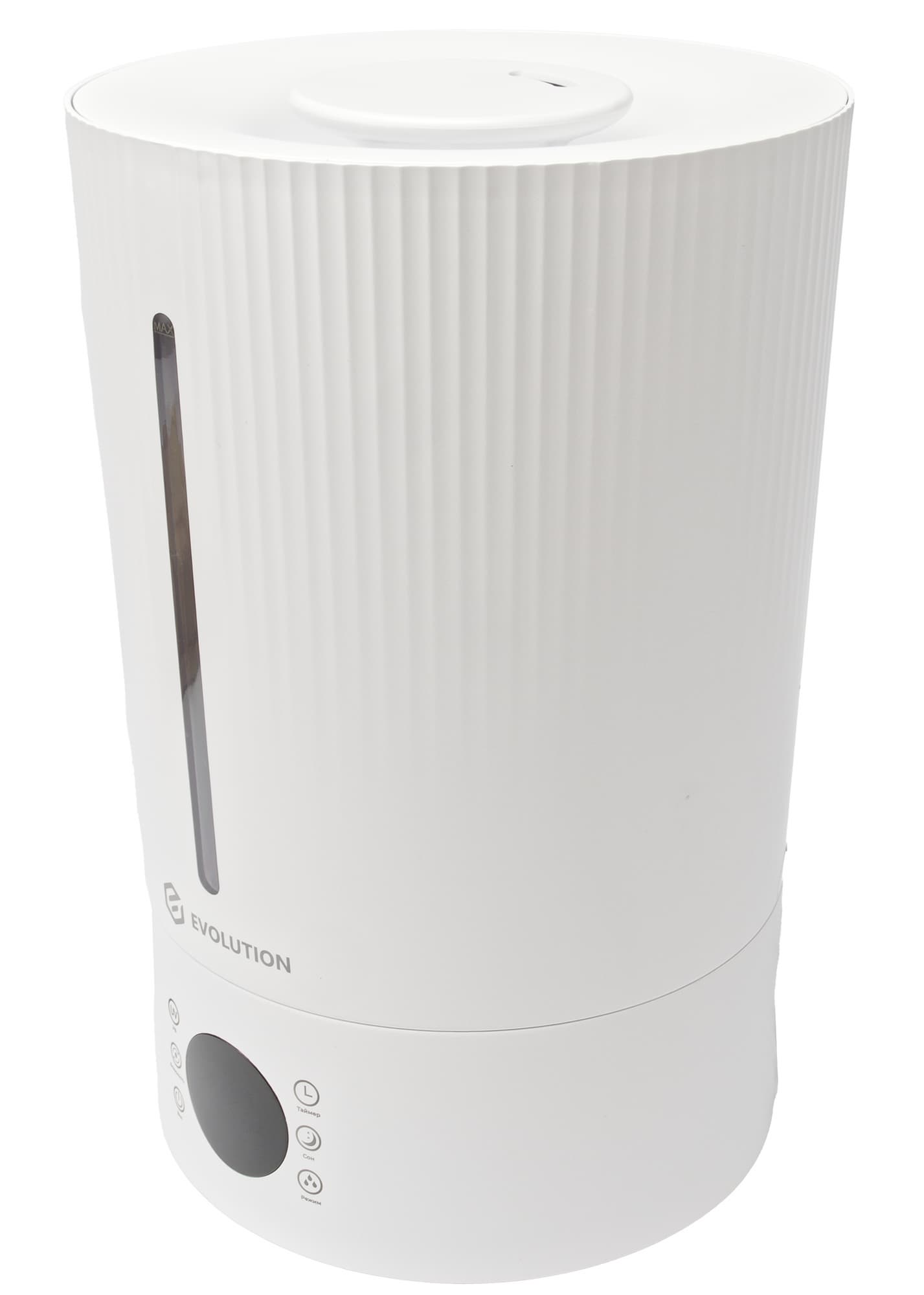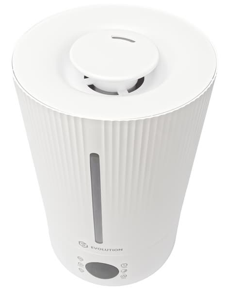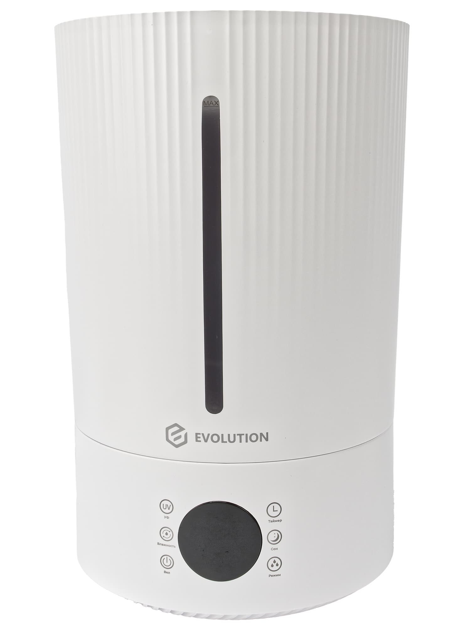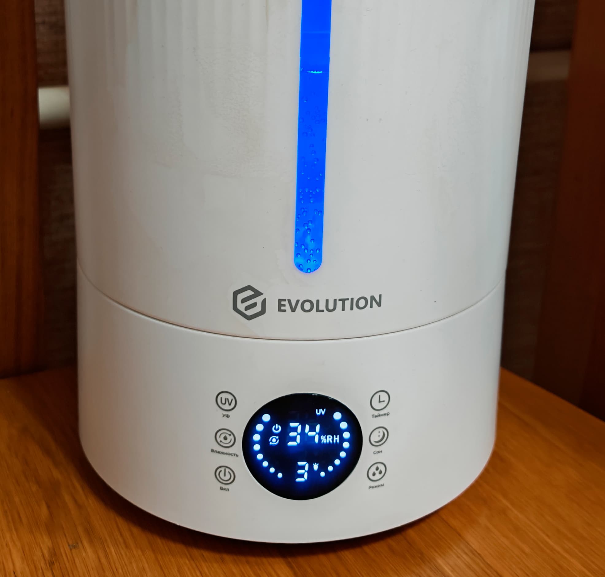 Корпус увлажнителя сделан из белого матового пластика. Выглядит он приятно: и качество литья, и качество сборки у прибора вполне достойное. На лицевой стороне бака находится вертикальная вставка из прозрачного материала, которая позволяет следить за уровнем воды, и логотип Evolution. Ниже, на лицевой стороне основания, имеется табло со светодиодной индикацией и сенсорные кнопки.