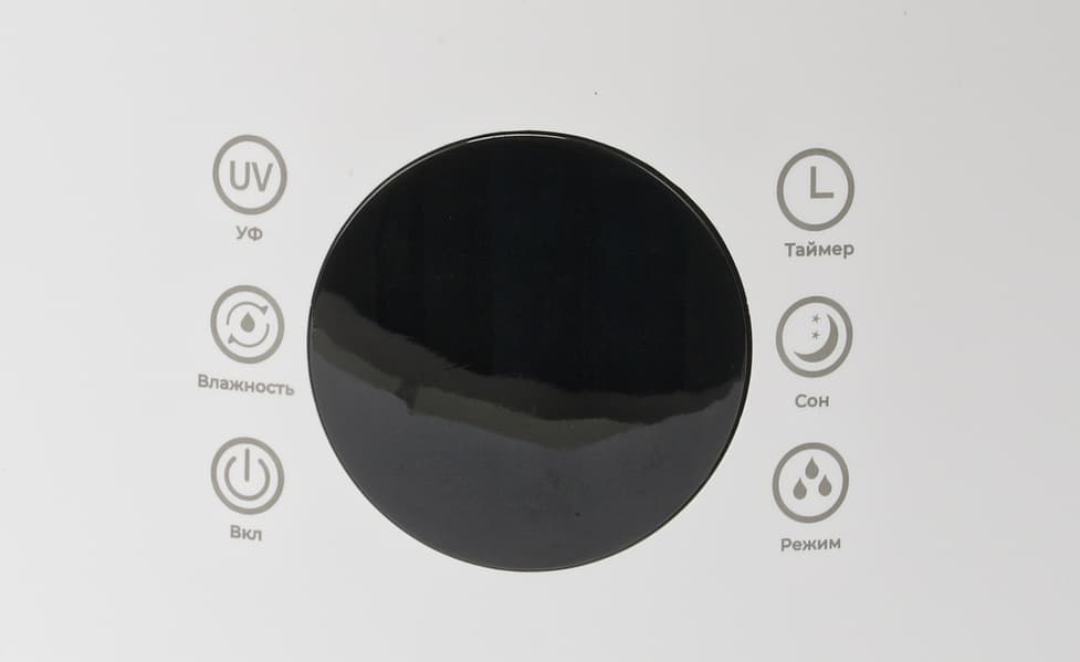 Панель управления увлажнителя включает два столбца сенсорных кнопок с белыми светодиодными индикаторами и светодиодное табло между ними. На табло отображается текущий выбранный режим и информация о влажности в помещении.