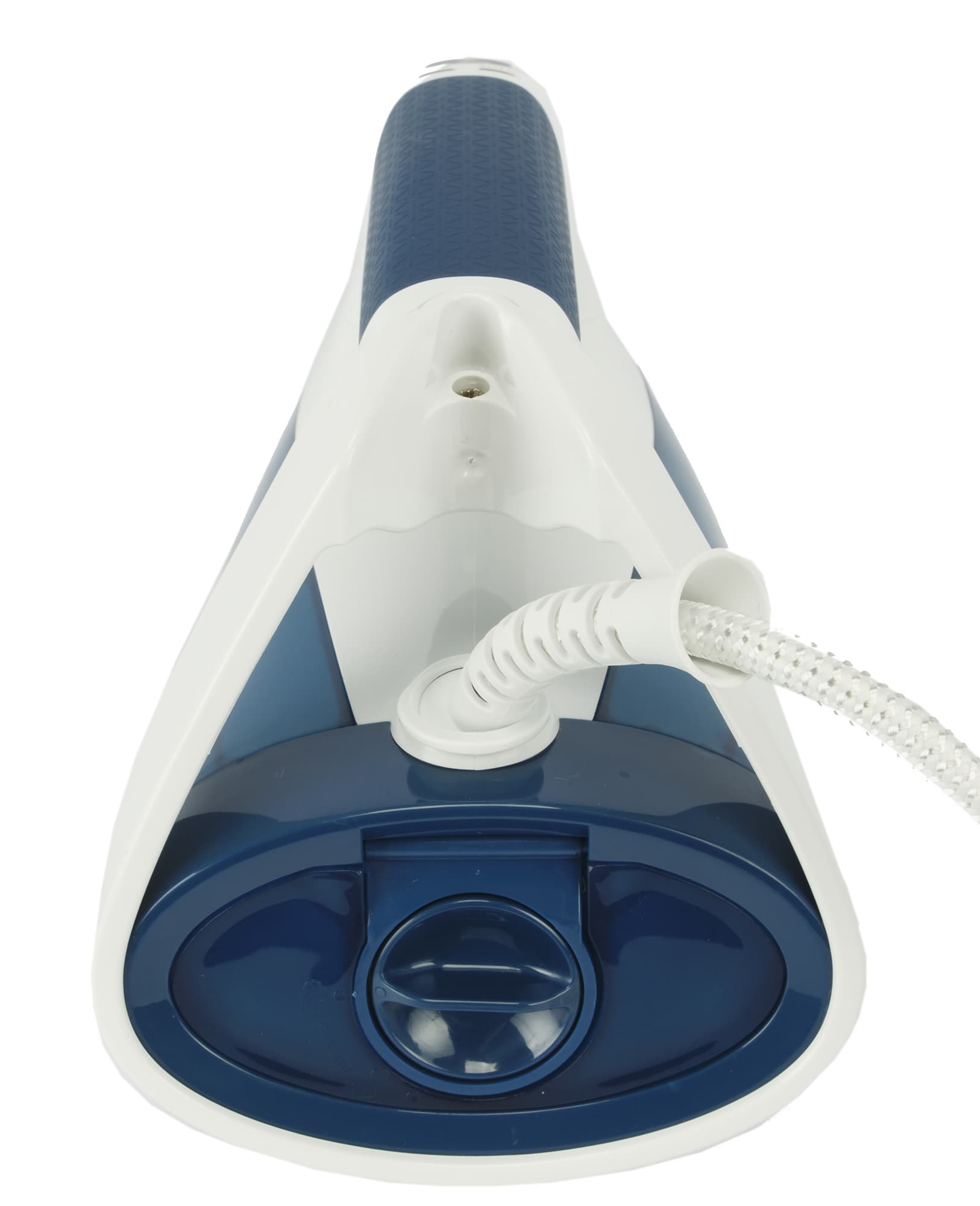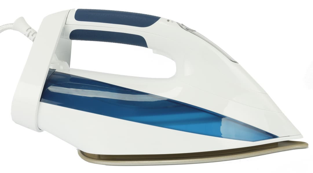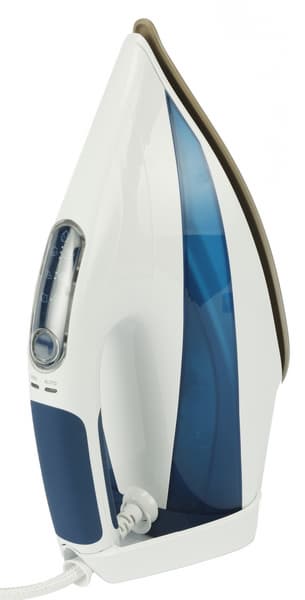 Утюг выполнен в сочетании двух наиболее привычных и нейтральных для приборов цветов — белом и синем. Корпус гладкий, рифленый узор нанесен на поверхности вдоль подошвы. Элементы управления — электронное табло с кнопкой и кнопка подачи пара находятся на ручке. Место соприкосновения ручки с ладонью пользователя покрыто прорезиненным материалом, похожим на soft touch. Материал приятен на ощупь и позволяет утюгу располагаться в руке надежно, без скольжения.