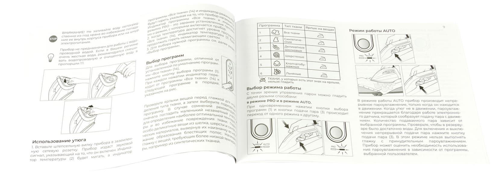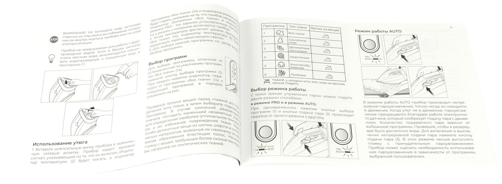 При включении прибора в сеть раздается звуковой сигнал, индикатор кнопки выбора программ начинает мигать. По умолчанию утюг работает в режиме Pro с самой первой программой «Все ткани». Согласно инструкции, этот режим оптимален для глажения слабо замятого белья. Пять остальных программ предназначены для глажения различных видов ткани. Удобно, что пользователь может не запоминать все обозначения, а сориентироваться в температурных режимах по более знакомому индикатору — точечкам. Одна точка — автоматическая программа и синтетика, две точки — шелк и шерсть, три — хлопок и лен.