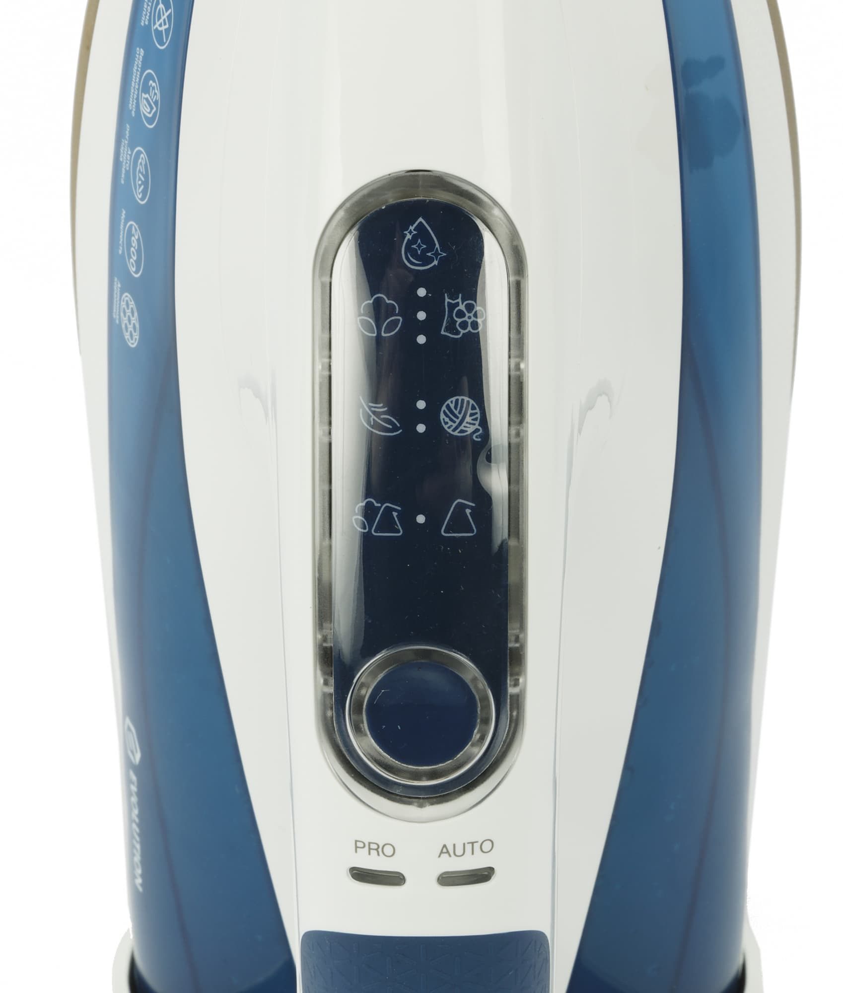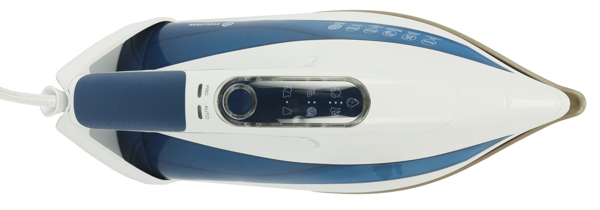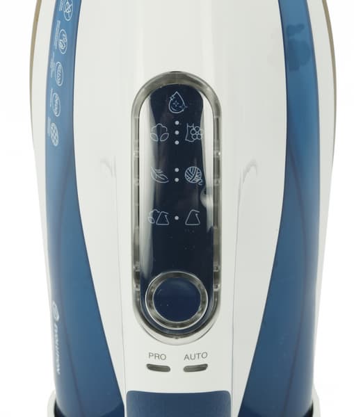 Все элементы управления сосредоточены в верхней стороне ручки утюга. Именно здесь находится электронное табло, а с обратной стороны — кнопка подачи пара. На дисплее расположена кнопка выбора программ с индикатором по периметру и семь световых индикаторов: шесть температурных режимов и программы удаления накипи.