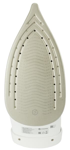 Подошва утюга имеет керамическое покрытие Evo Anion Ceramic. По заявлению производителя, анионная керамическая подошва с эффектом ионизации убирает статику с ткани. В центральной части поверхность гладкая, по боковой части видны два желобка, у носика появляется небольшой третий. Во внутреннем, дальнем от края, желобке располагаются отверстия выхода пара. Обращает на себя внимание форма носика — сужающаяся, вытянутая и округлая в вершине. На основании корпуса ниже подошвы можно увидеть наклейку с краткой технической информацией об утюге.