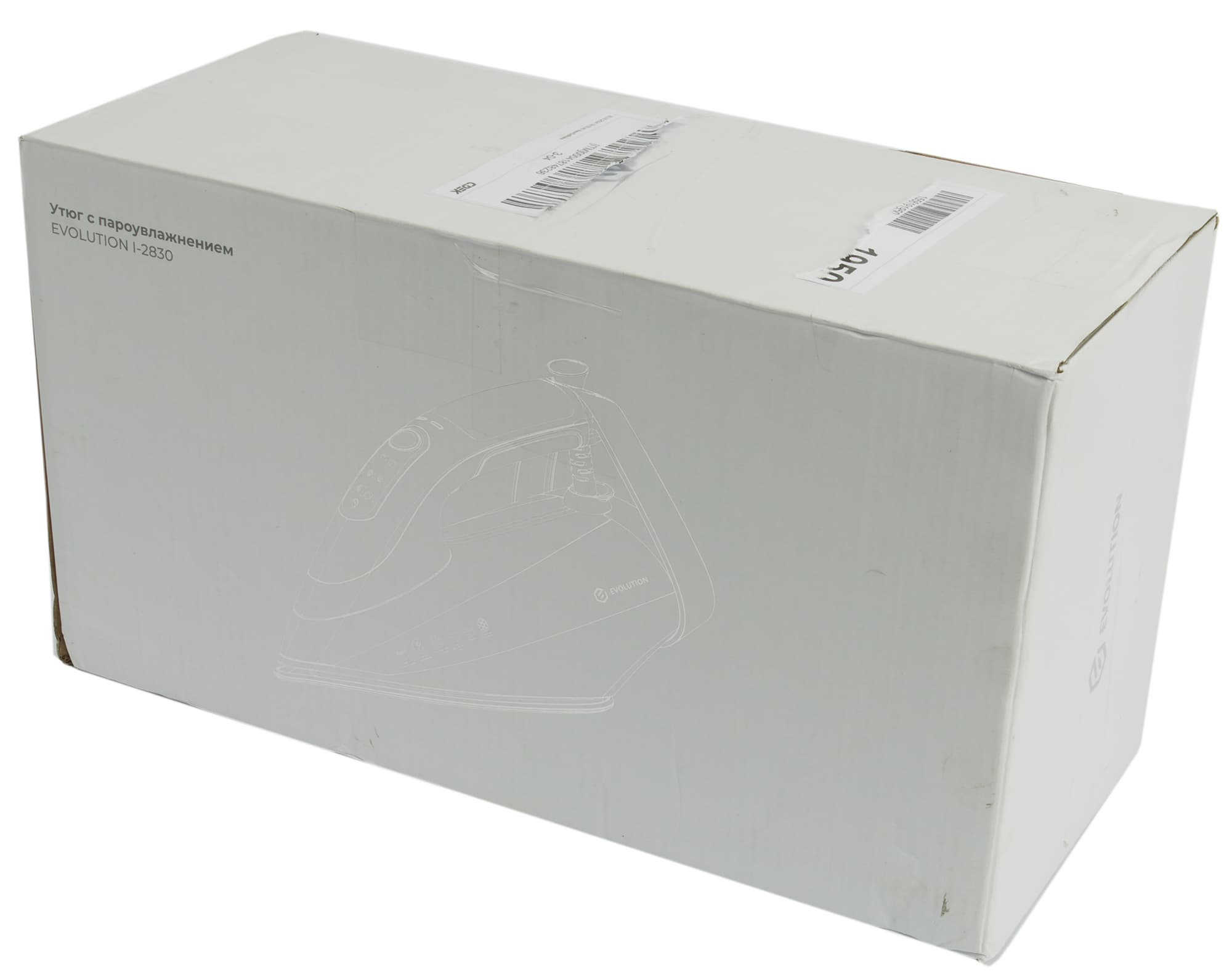 Утюг Evolution I-2830 прибыл к нам в коробке, изготовленной из плотного белого картона. Оформление упаковки минималистично: на одной из сторон серебряным цветом графически изображен прибор, на другой — приведено его описание и технические характеристики. Упаковка не оснащена ручкой для переноски.