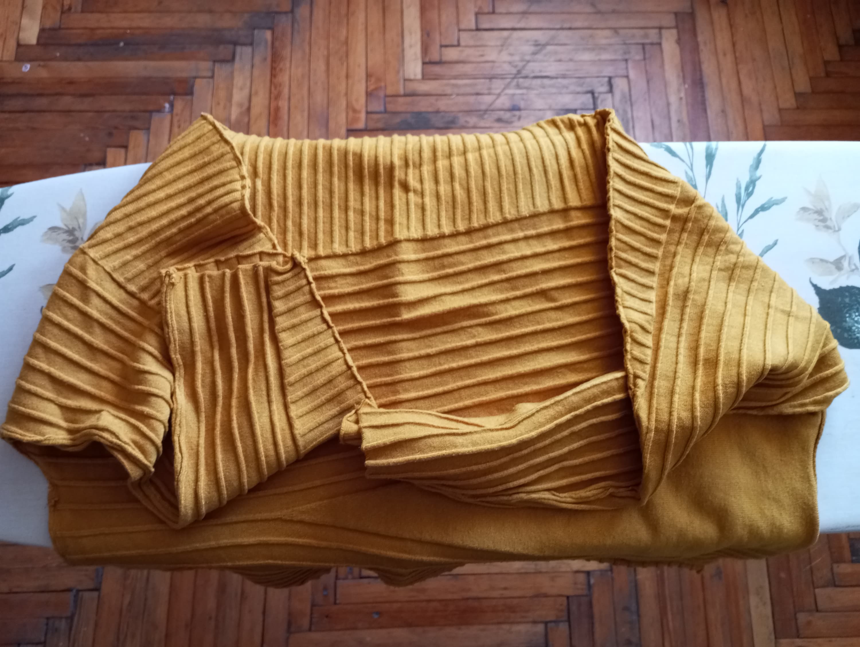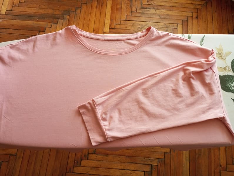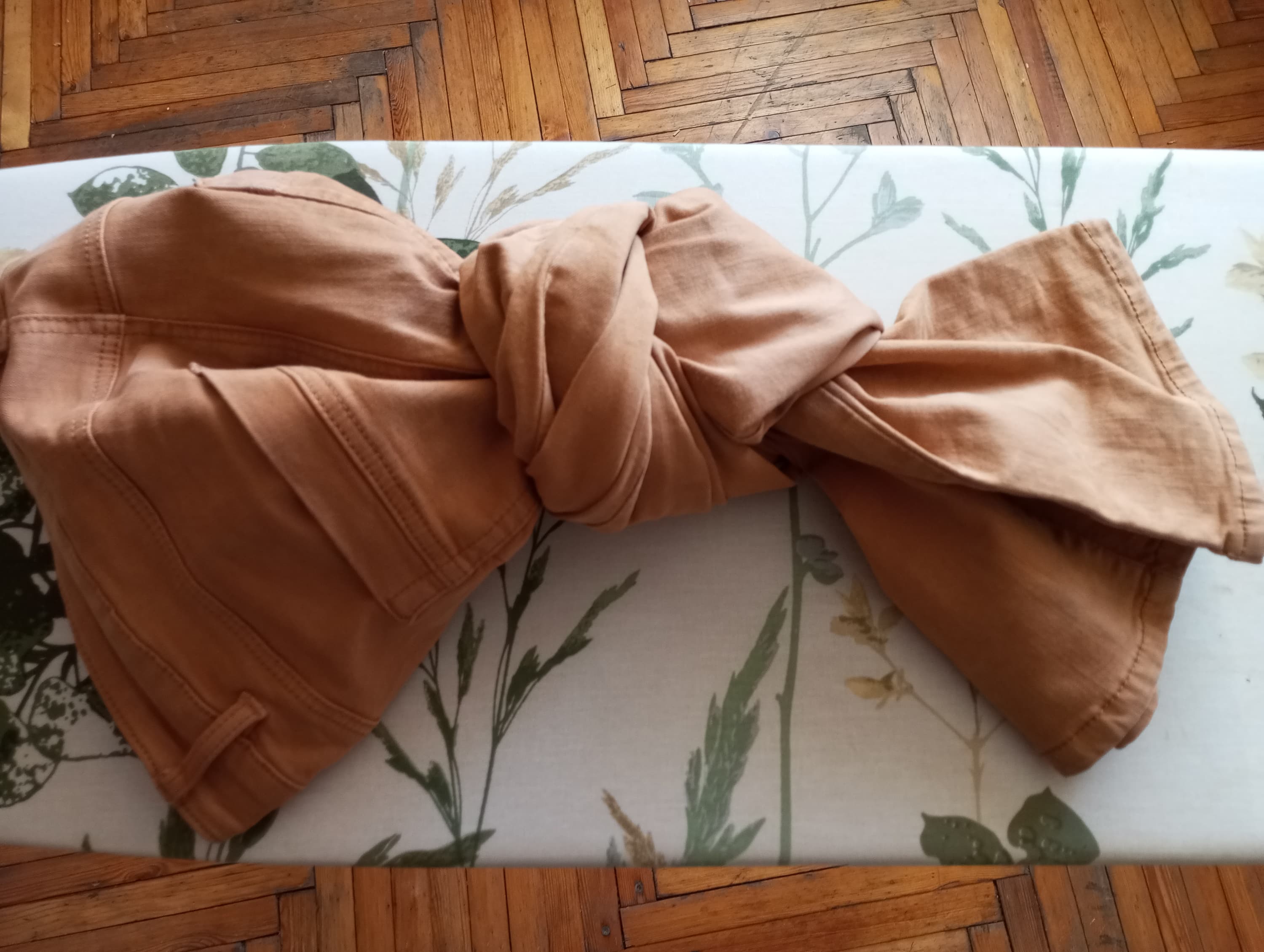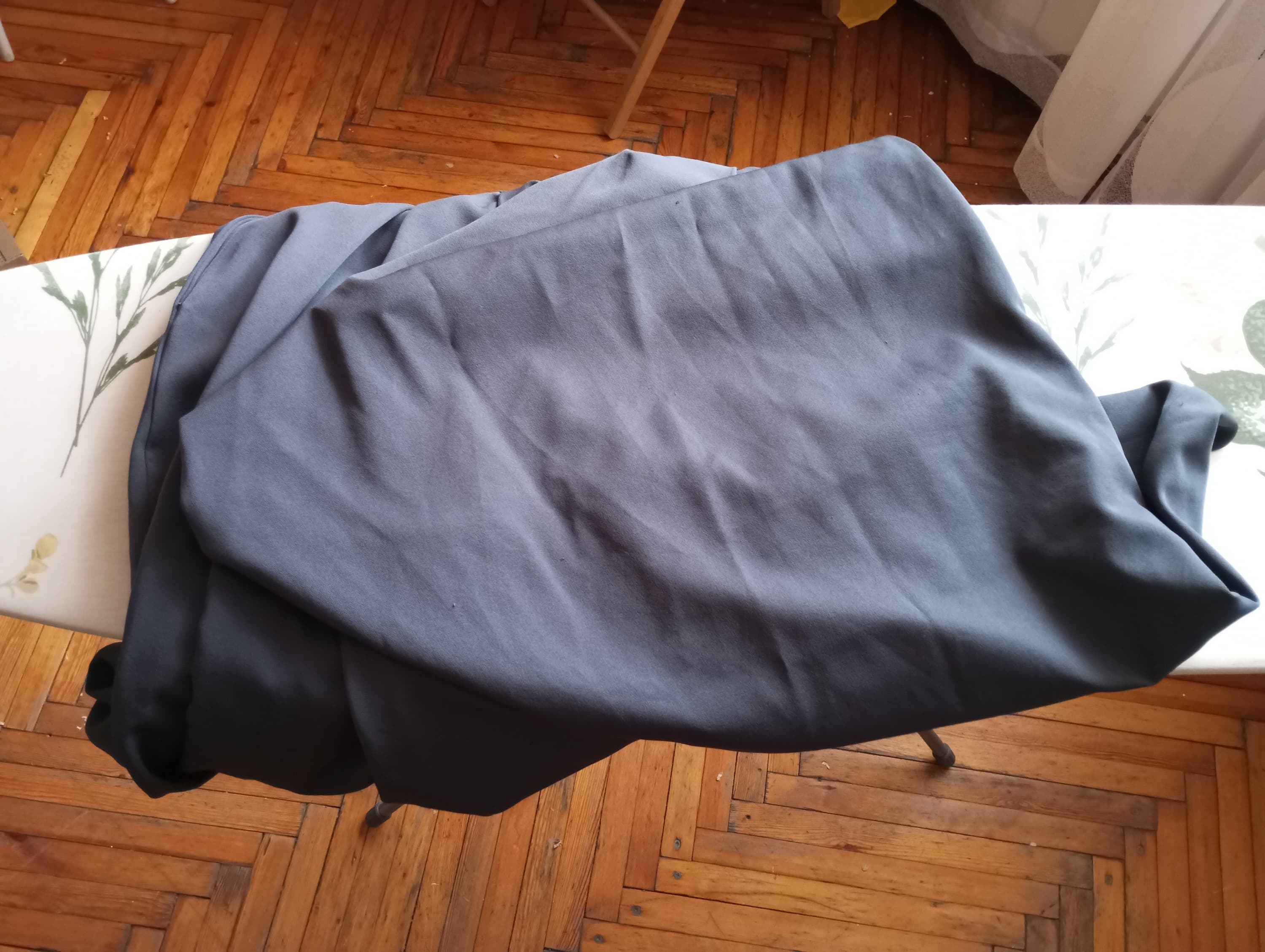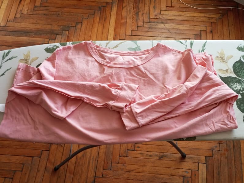 Ткань, которая легко и охотно деформируется и теряет цвет. Задача не только разгладить, но и проверить, как утюг обрабатывает такое. Средний режим, немного пара.
