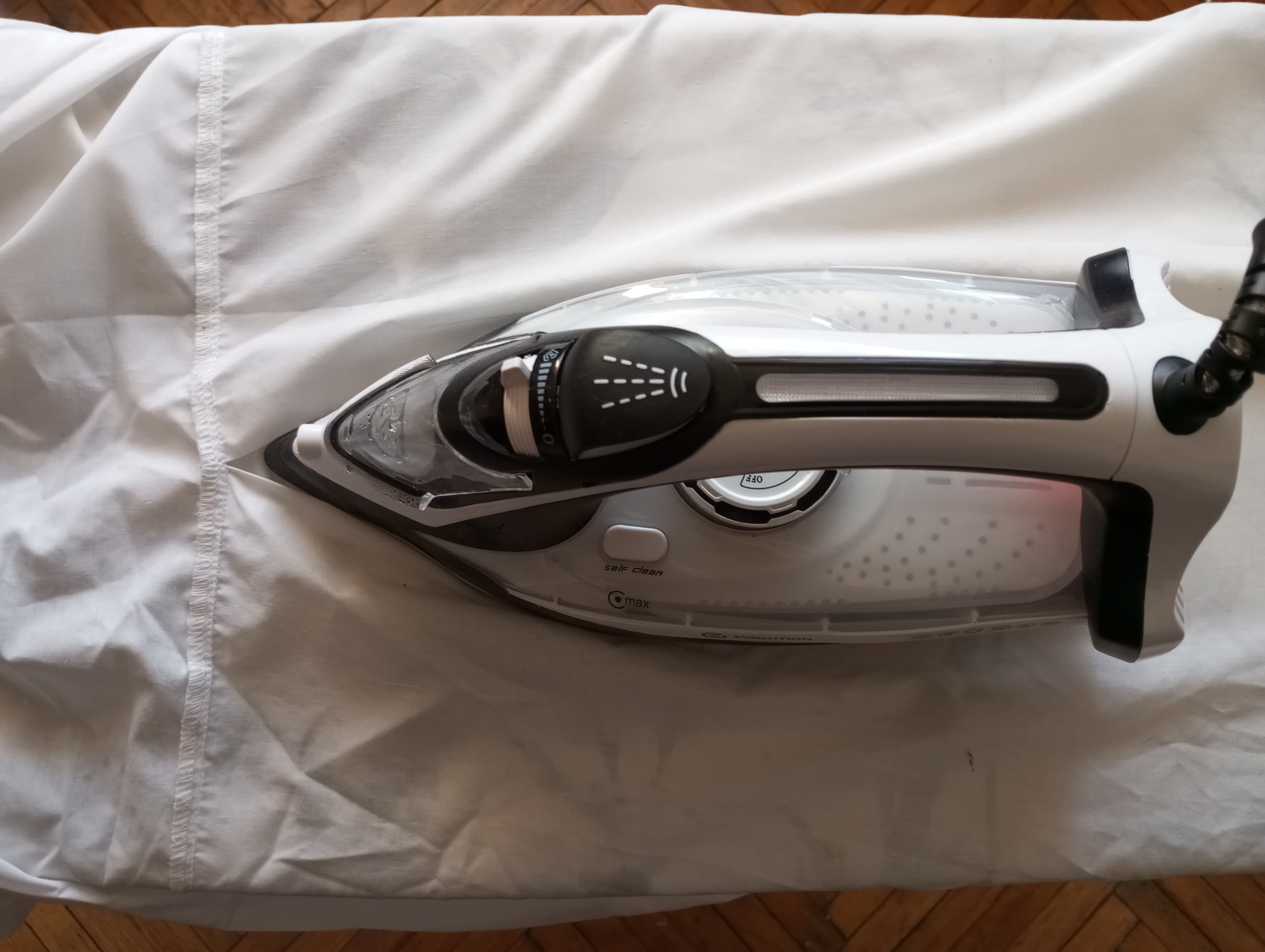 Проблема любой хозяйки: даже сатиновый пододеяльник, сложенный в четыре раза, никогда не разглаживается с одной стороны. Тест провели стандартный: разгладили первый раз, перевернули — прогладили, сложили еще в два раза и повторили процесс. Средний температурный режим и немного пара.