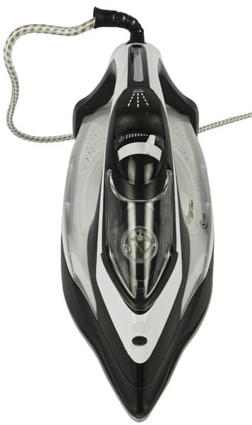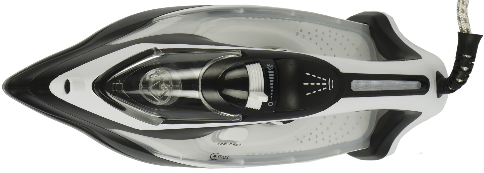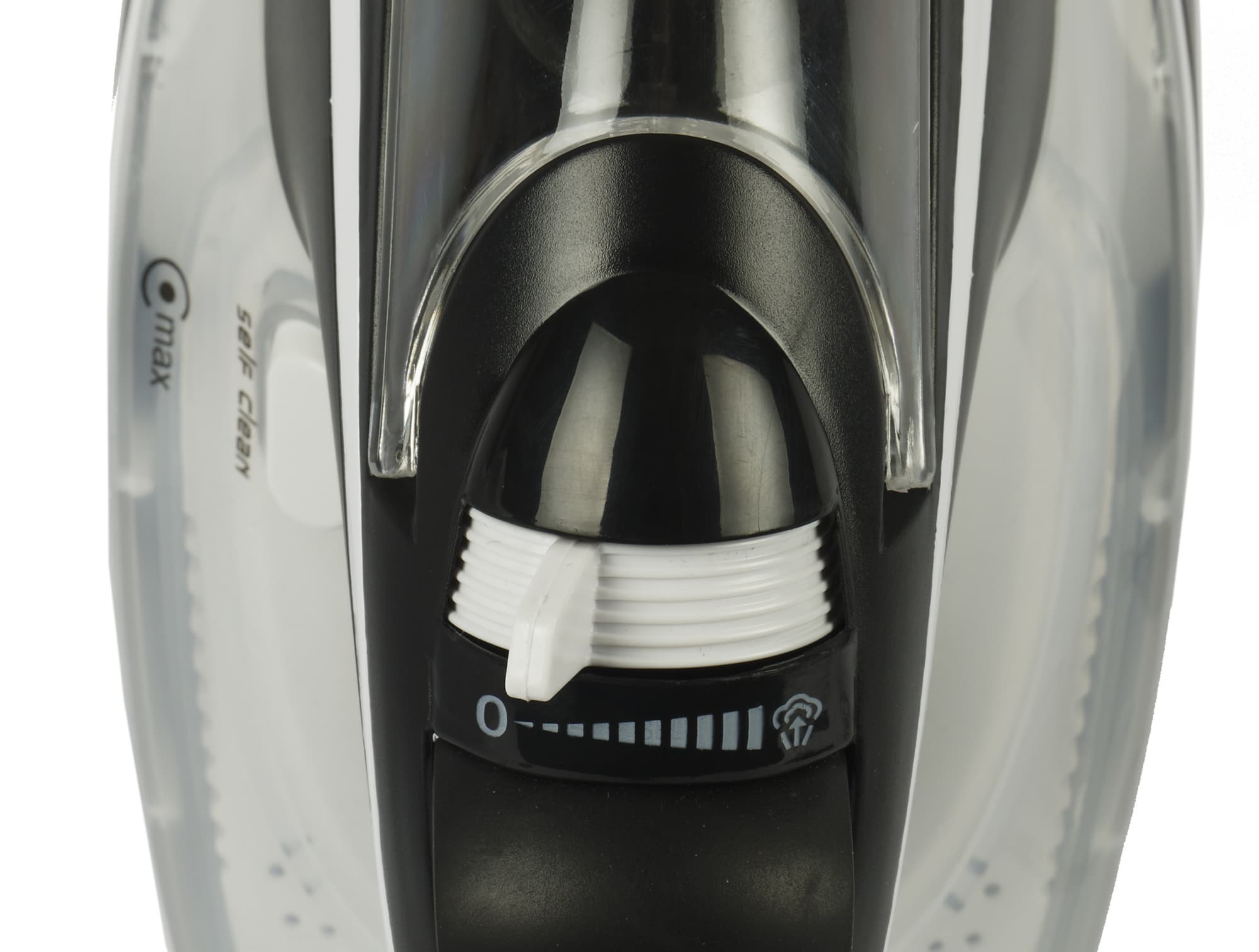 Рычаг регулировки подачи пара предельно прост, шкала измерения при нем не имеет единиц, просто подъем от нуля до максимума. Кнопка разбрызгивания тоже довольно тугая, проблематично случайно нажать ее, а ровно под ней, на обратной стороне ручки расположен весьма плавный курок подачи пара. Низ корпуса сделан из черного пластика, а верх — из прозрачного, что позволяет наблюдать уровень воды в большом резервуаре на 450 мл. Под ручкой на корпусе расположен круглый регулятор температурных режимов, рядом с ним, как это часто на современных моделях паровых утюгов, кнопка самоочистки.
