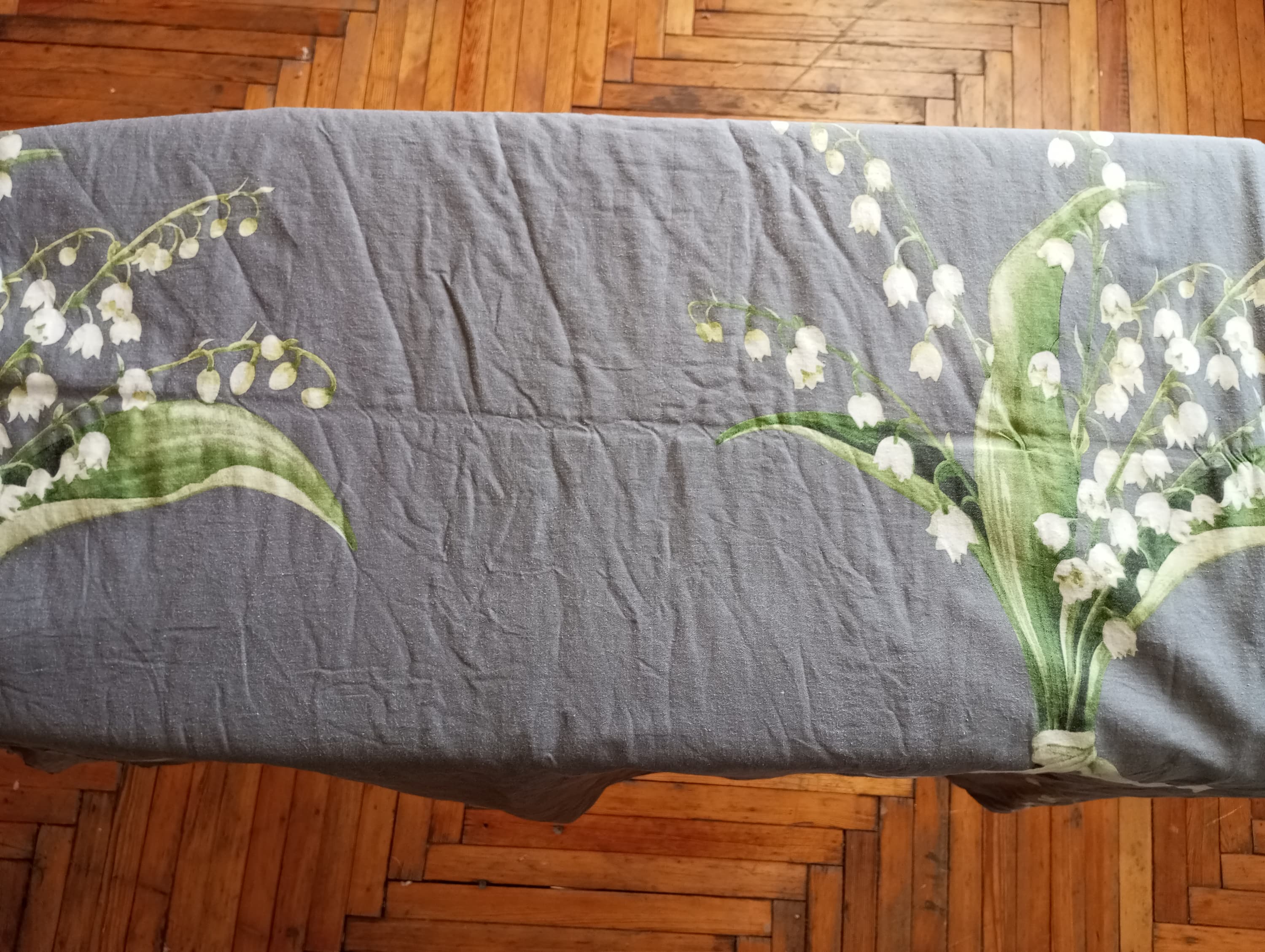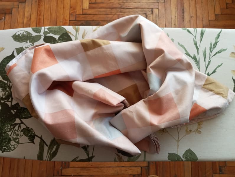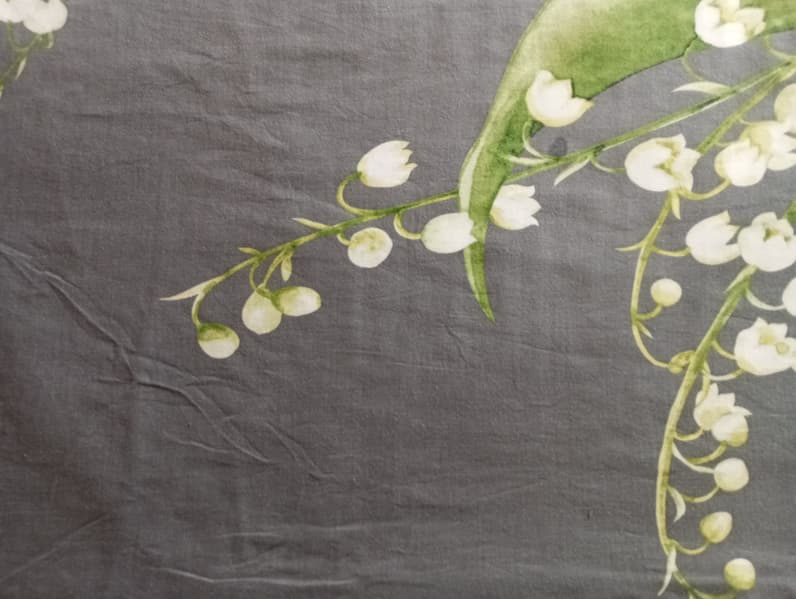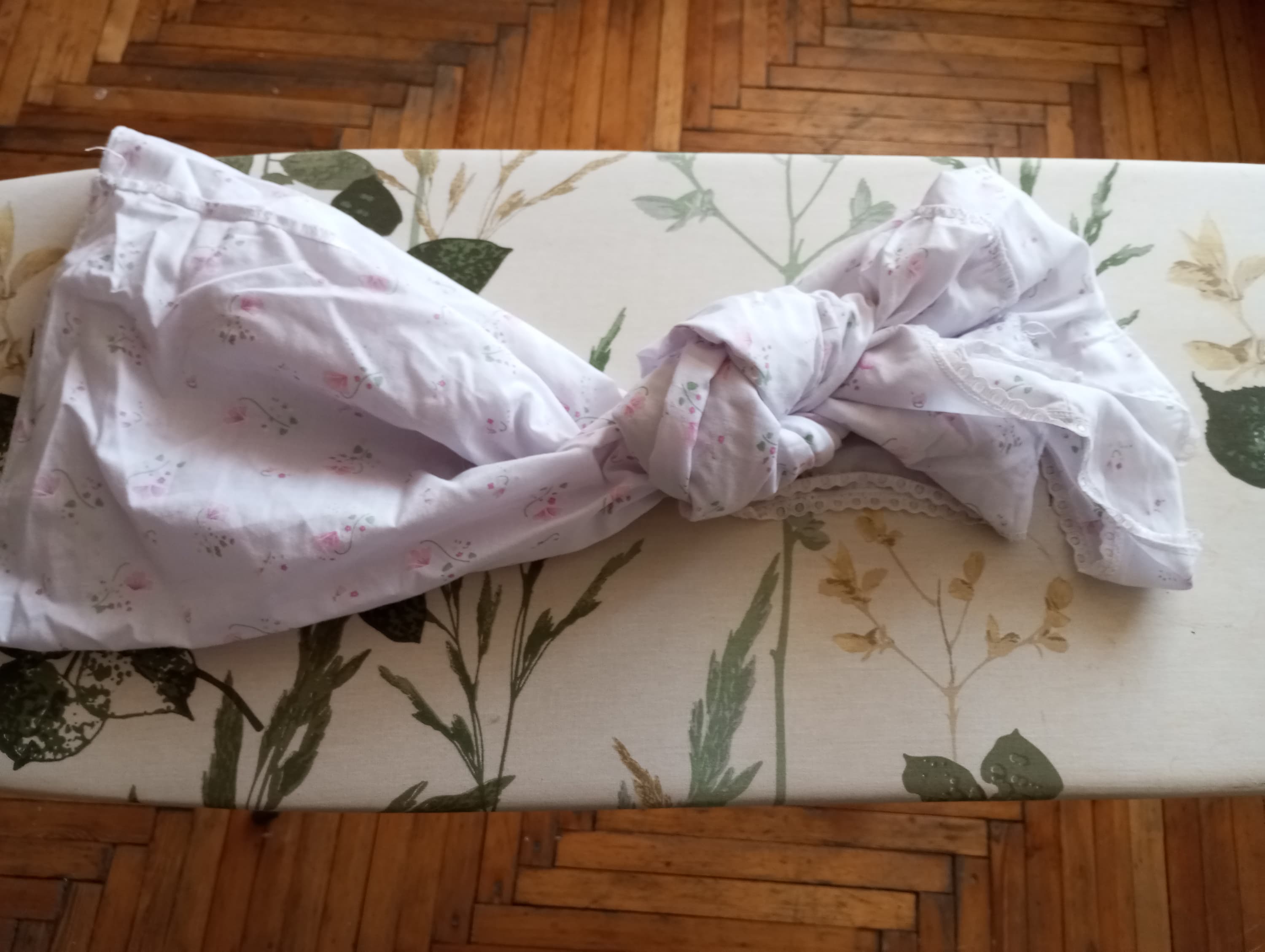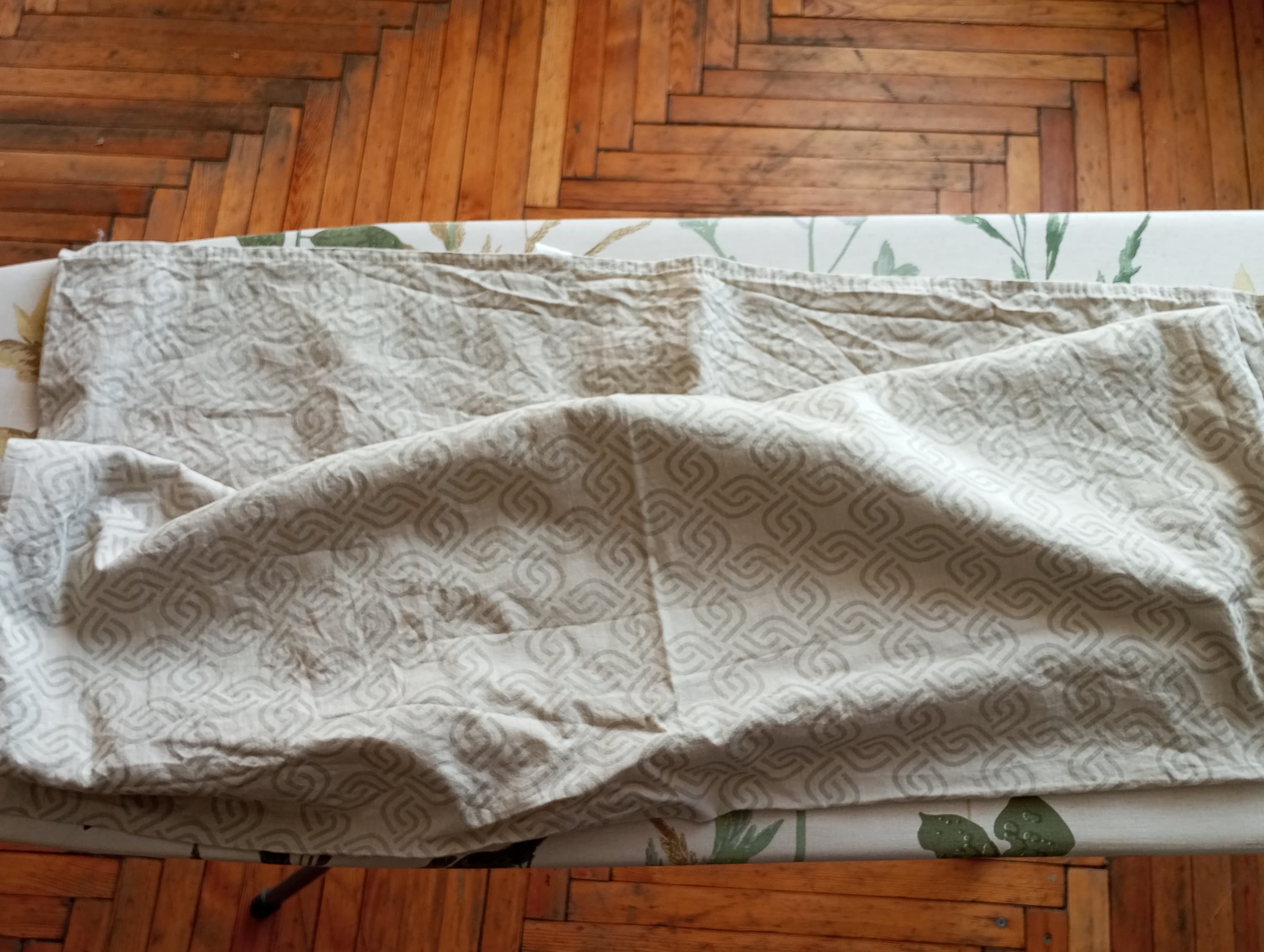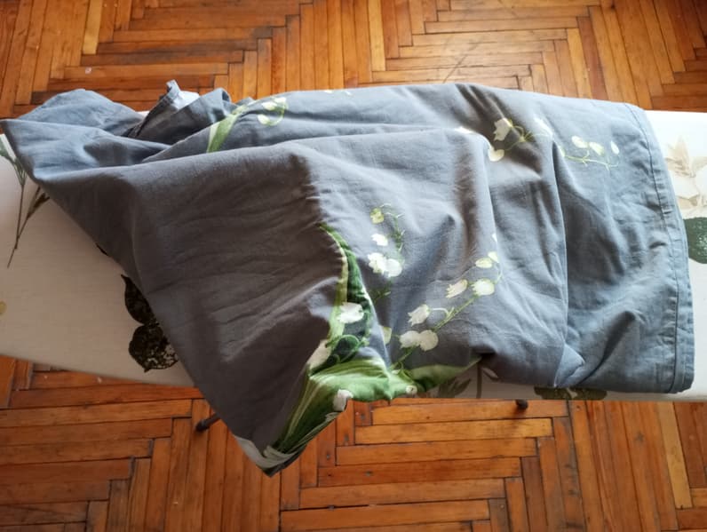Еще один популярный материал, охотно мнущийся. Обычно он не доставляет труда с разглаживанием, поэтому усложнили задачу: пересушили белье. Средний температурный режим и разбрызгивание, ушло меньше минуты, чтобы привести наволочку в порядок.