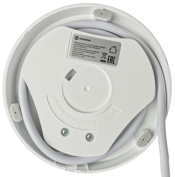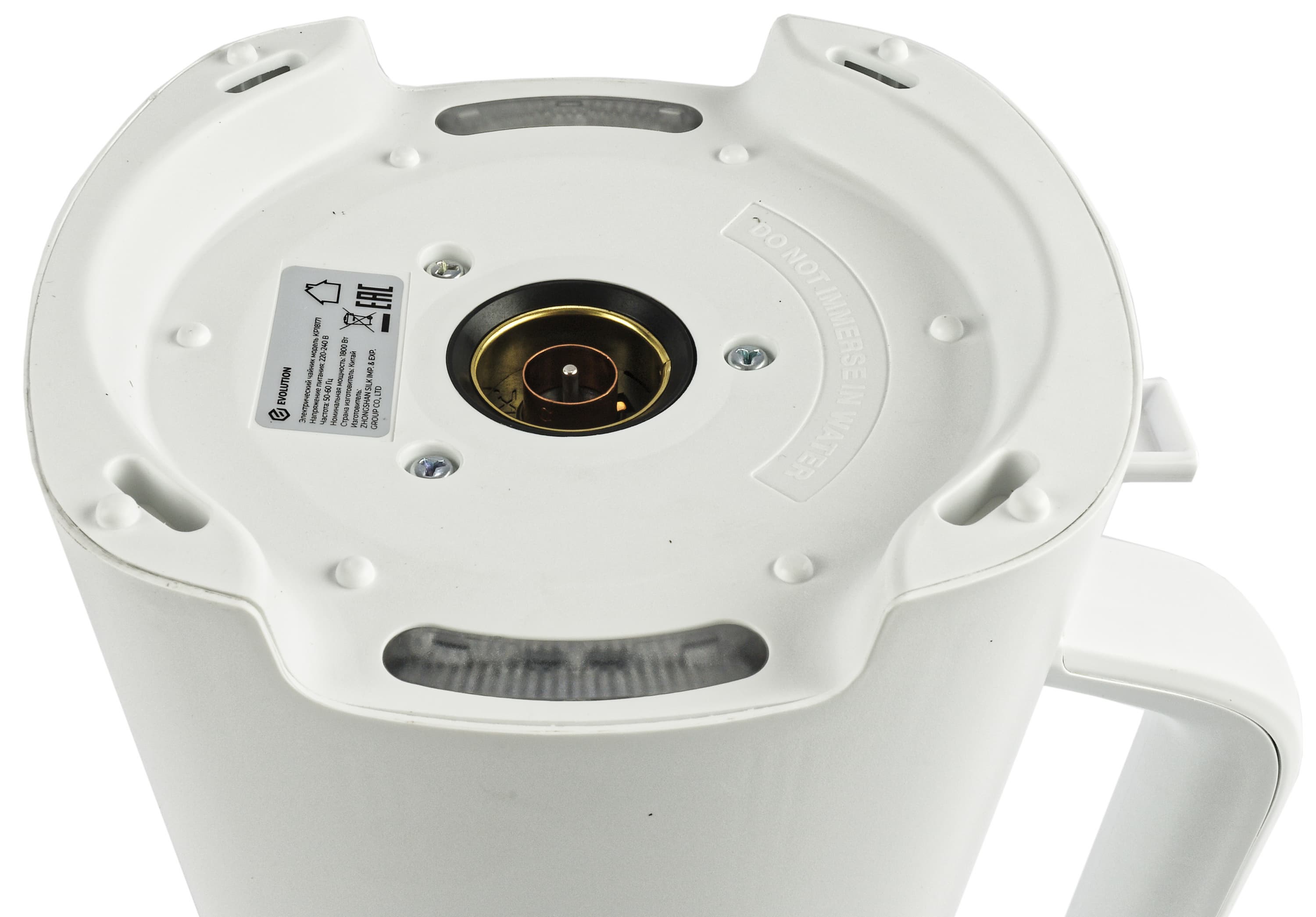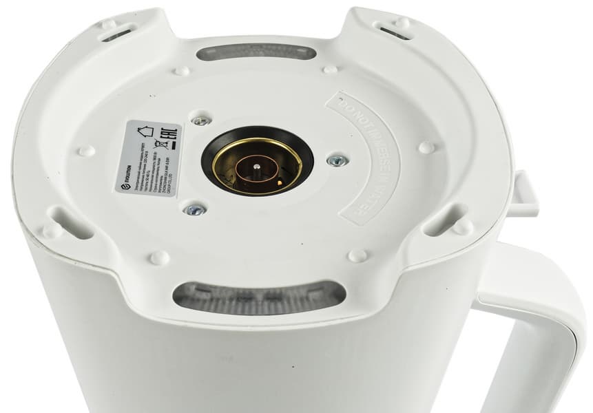 На дне чайника находится шильдик с краткой технической информацией о приборе, несколько вентиляционных отверстий и два окошка со светодиодами, обеспечивающими подсветку чайника снизу во время работы. Контактная группа, состоящая из одного кольца и центрального штыря, произведена английской компанией Strix — одним из самых известных производителей этих компонентов.