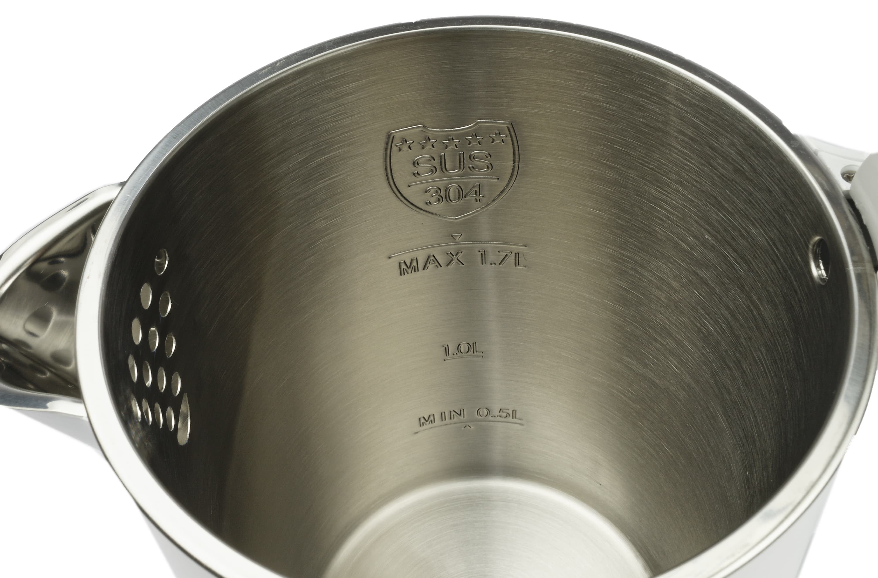 Взглянув на открытый чайник сверху, мы видим стенки и дно из нержавеющей стали. Также внутри нанесена объемная градуировка из 3 рисок — 0,5, 1,0, 1,7 л.