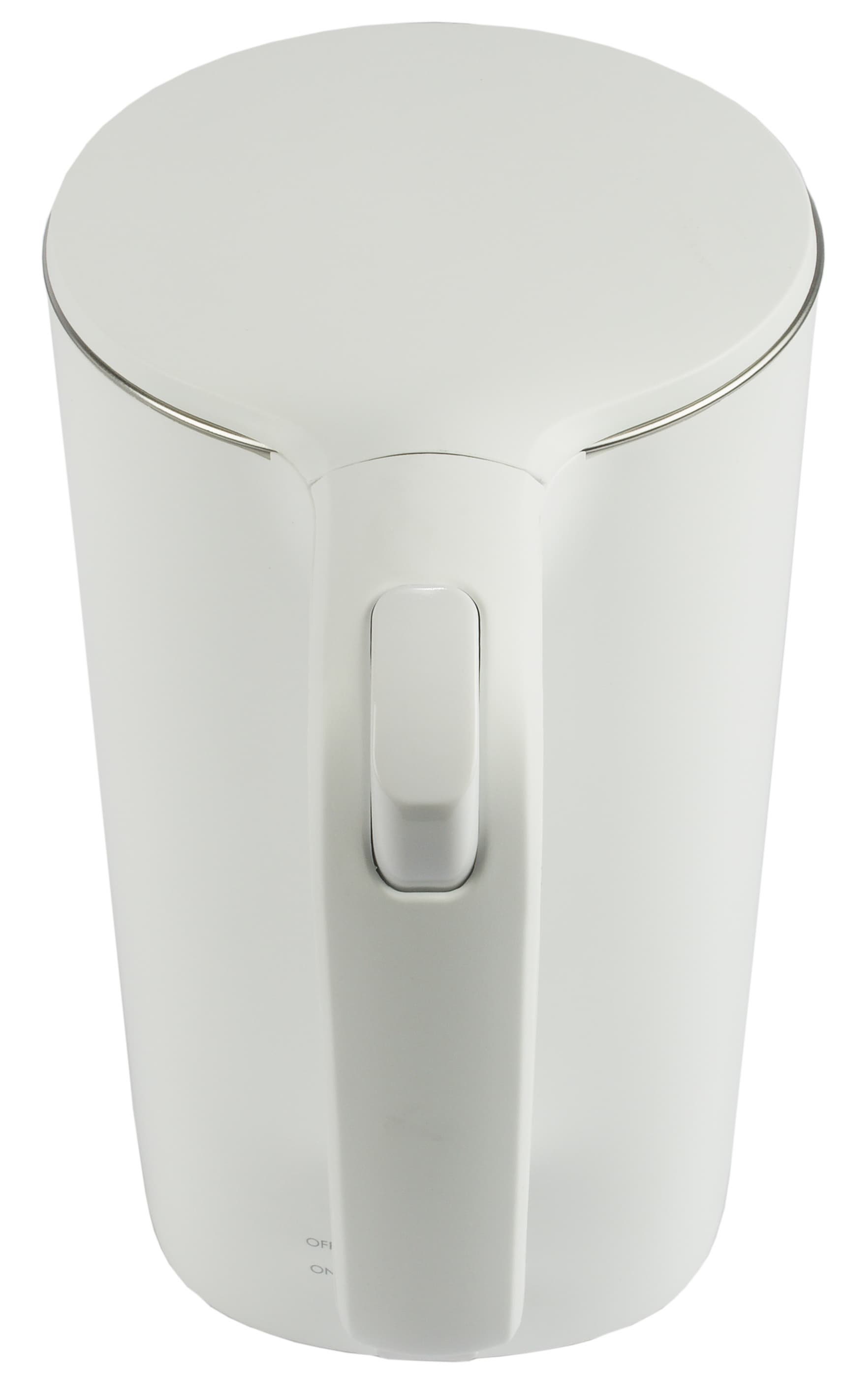 Крышка чайника сделана из белого противоударного пластика снаружи и нержавеющей стали внутри. С помощью кнопки крышка беззвучно и плавно откидывается примерно на 60 градусов, можно дополнительно приоткрыть ее вручную до 80 градусов. Закрывается крышка вручную легким надавливаем на нее.