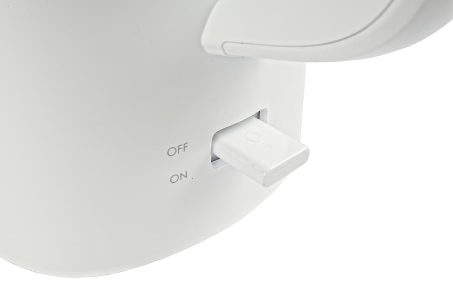 Ручка чайника сделана из пластика. Она полностью белая, как и кнопка открывания крышки, находящаяся на ней сверху.
