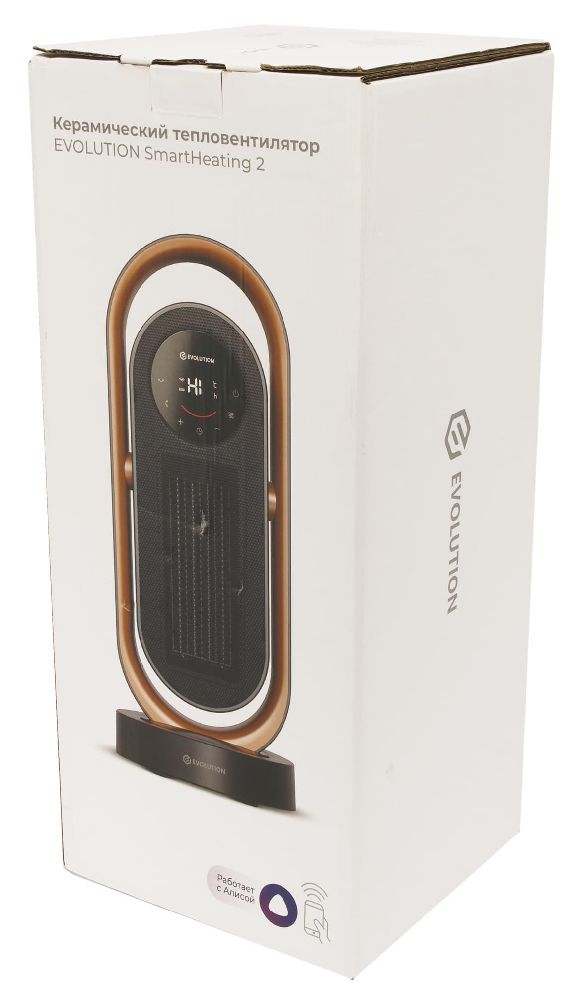 Тепловентилятор Evolution SmartHeating 2 поставляется в небольшой вытянутой коробке из прочного гофрокартона. На передней стороне размещена полноцветная фотография работающего прибора. В нижней части мы видим логотип Алисы, благодаря которому сразу понимаем — наше устройство может управляться голосом. Рядом — значок смартфона, подсказывающий, что допускается и дистанционное управление с помощью мобильного приложения.