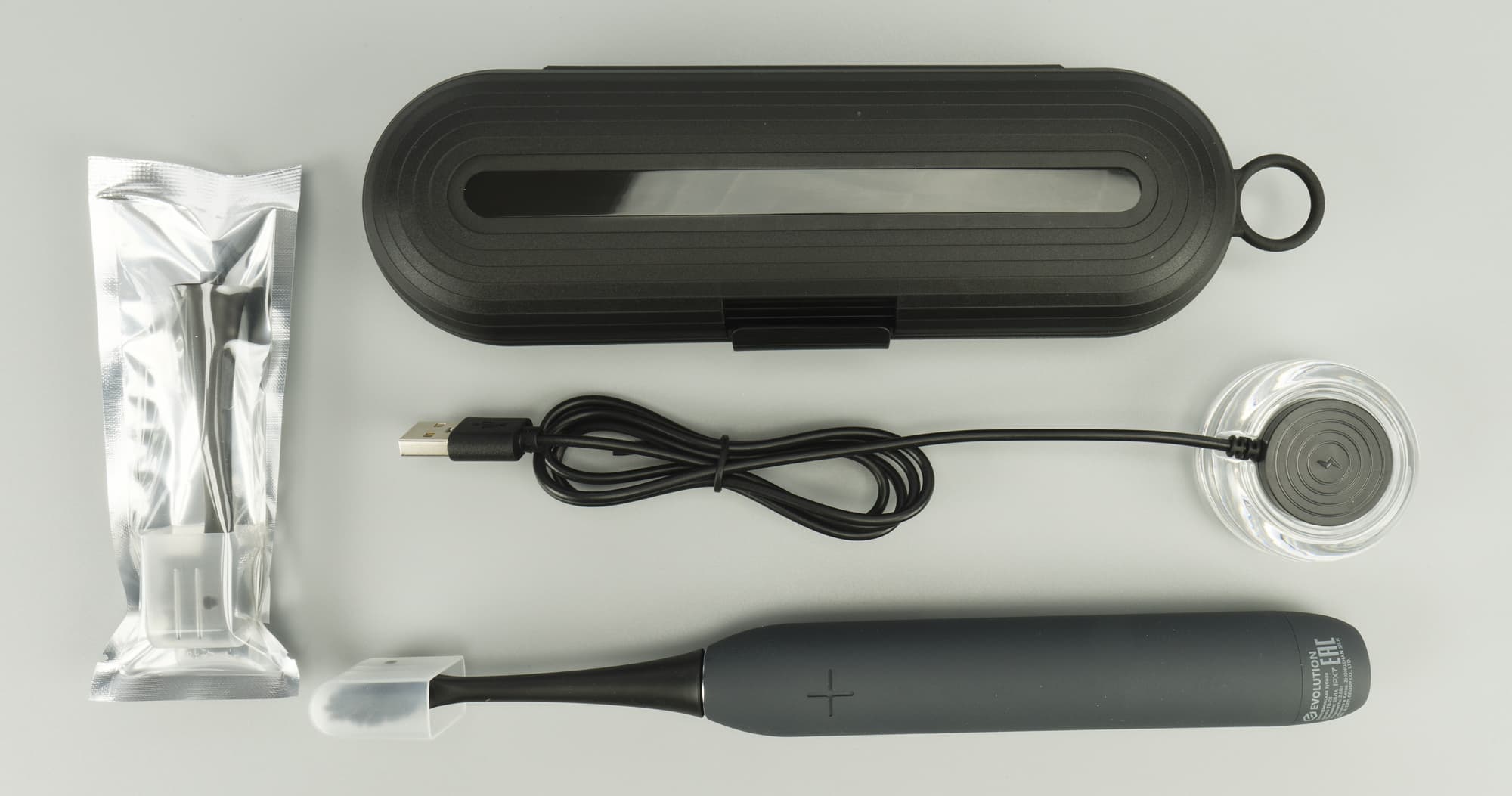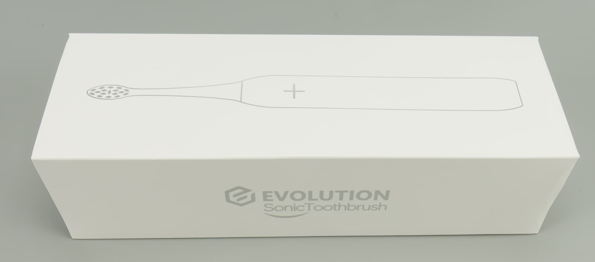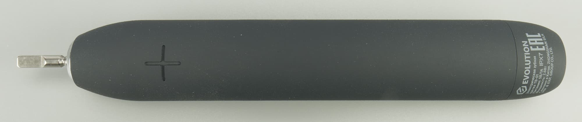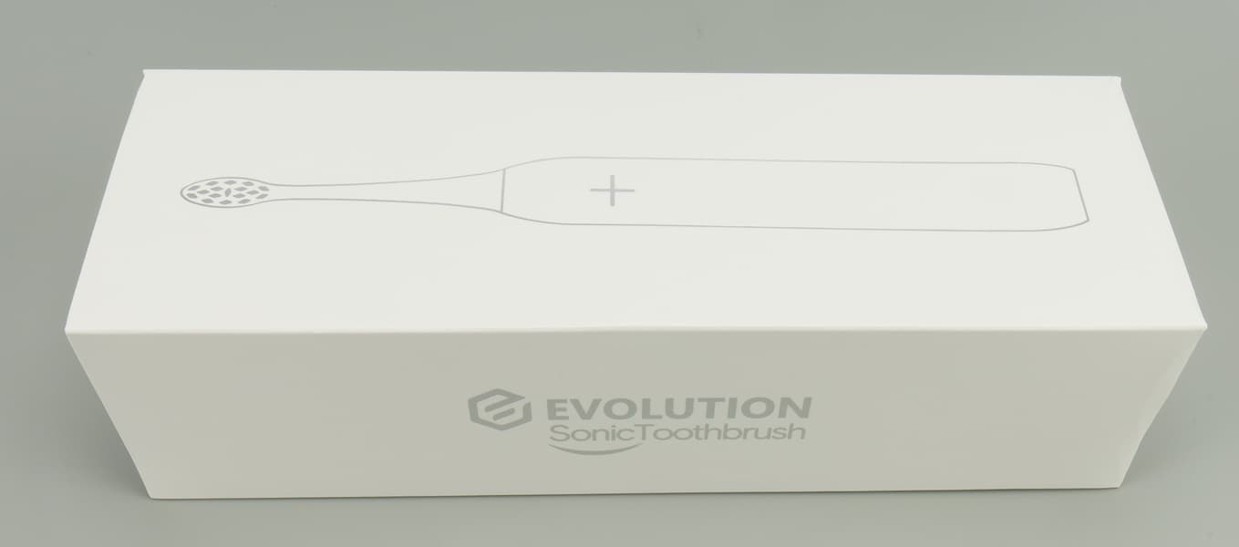 Щетка прибыла на тесты в очень аккуратной, вытянутой белой коробке. Упаковка у Evolution TB-01 компактна и элегантна, сверху крышка-пенал с абрисом щетки на титульной стороне, именем бренда серебристым шрифтом по бокам и кратким описанием продукта на обратной стороне. Там мы нашли функционал, комплектацию, основные характеристики, юридическую информацию, штрих-код и дату изготовления.