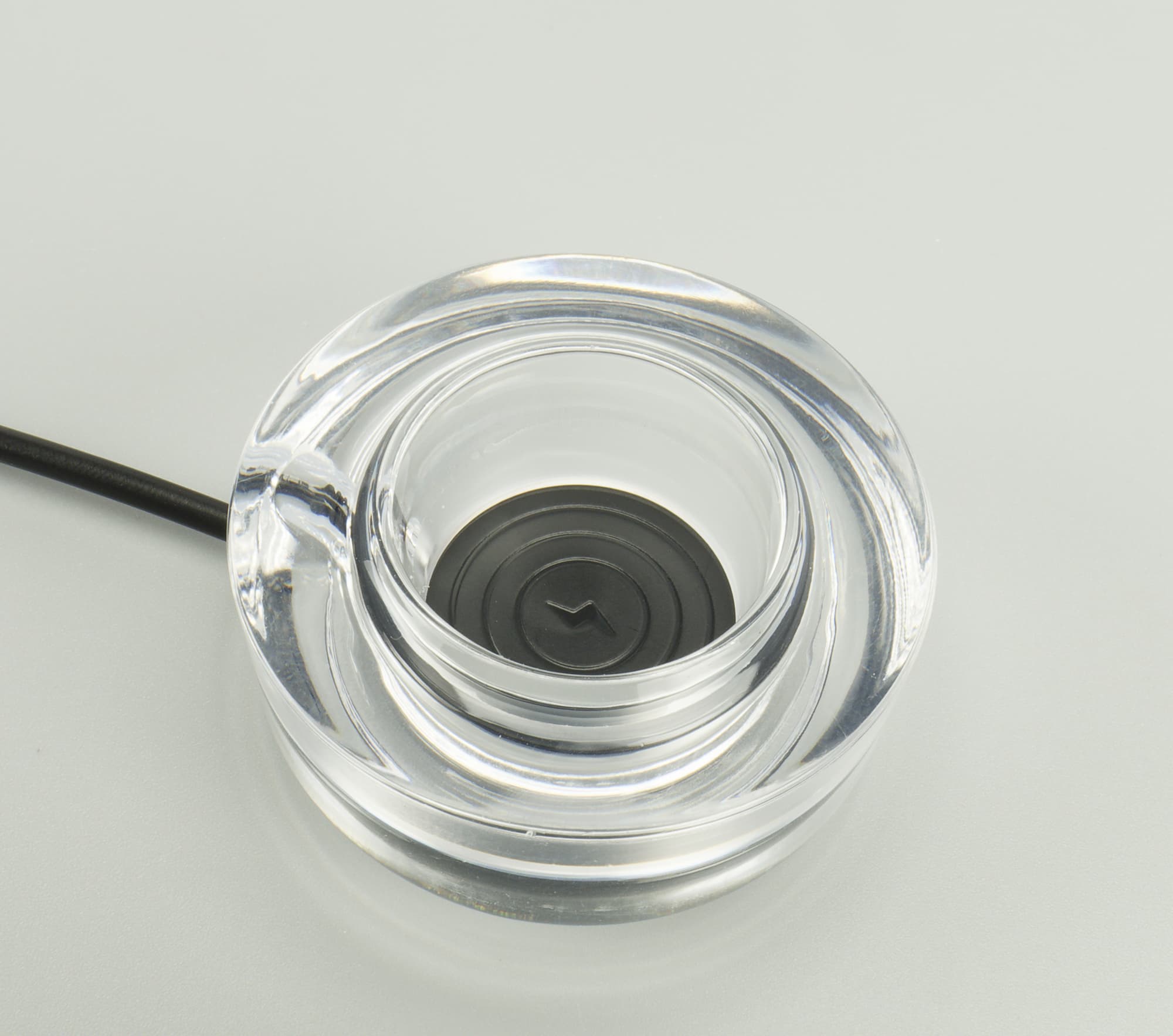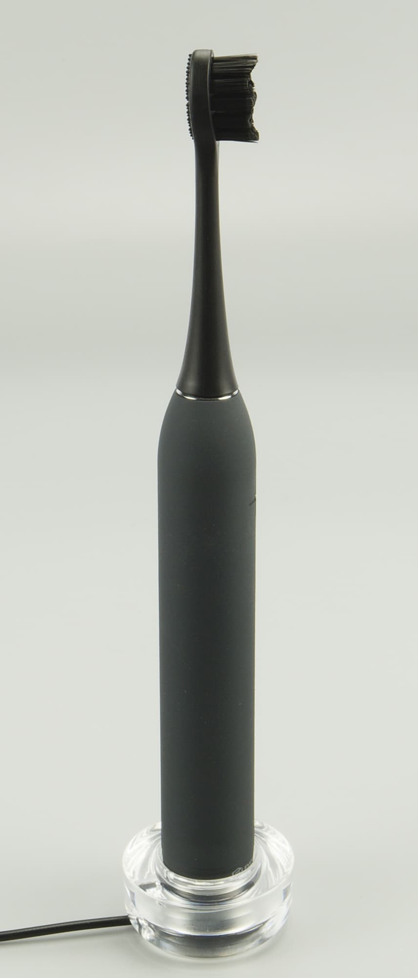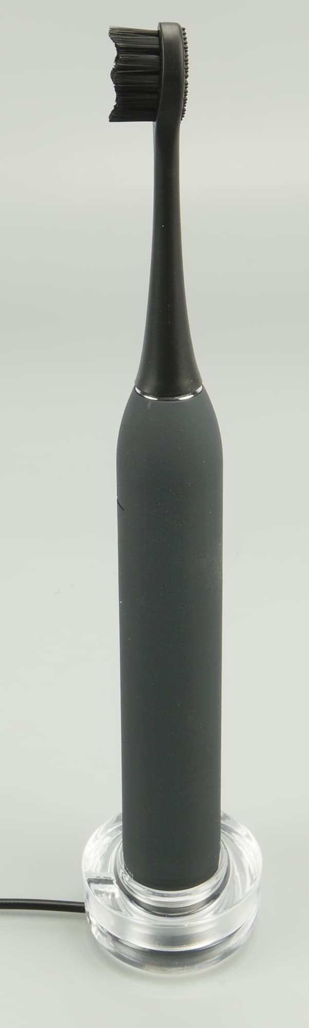 Основание щетки неприметно откручивается, там прячется катушка для индукционного способа заряда — колпачок снимается, а Evolution TB-01 устанавливается на компактную платформу док-станции с USB-портом. Для большей устойчивости она оборудована специальной округлой прозрачной подставкой, куда, как в низкую карандашницу, мы ставим щетку.