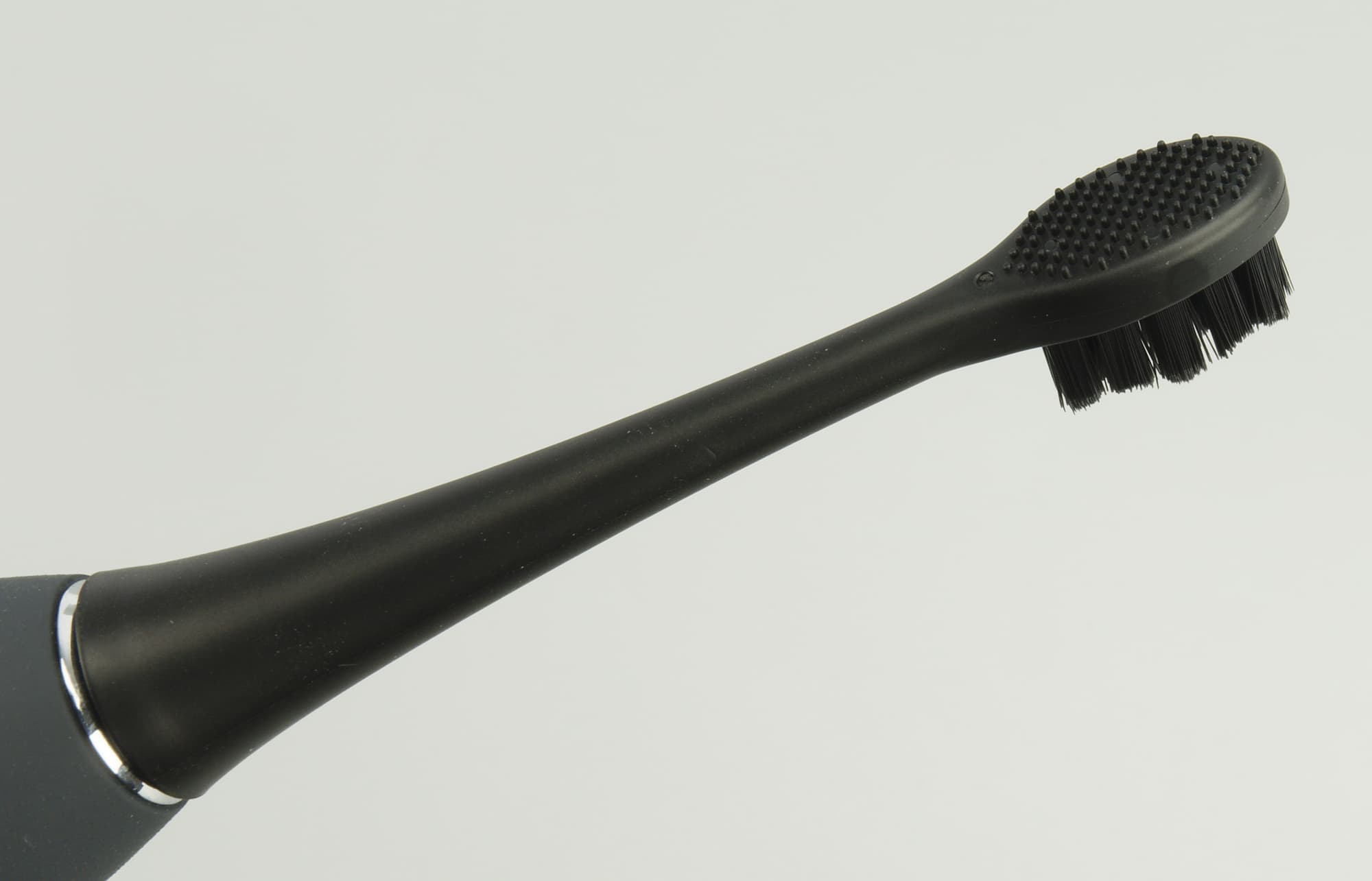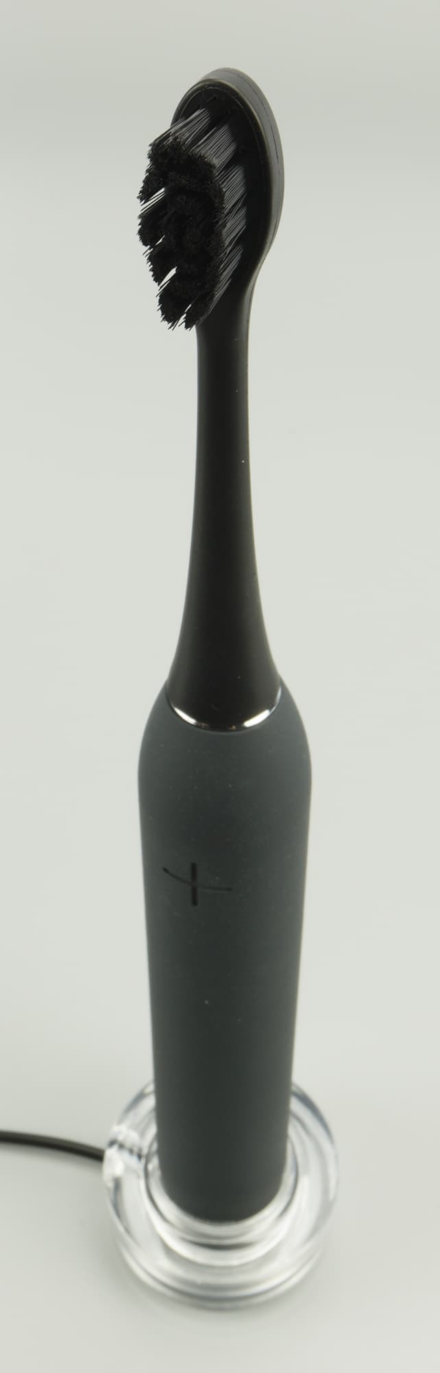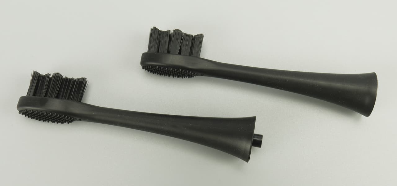 Насадка щетки по своей форме и качеству ничем не отличается от обычной зубной щетки, а благодаря почти невесомому корпусу, сравнение становится еще более уместным. Отличие ощутимо даже рукой — насадка вибрирует и «поет». Звук подсказывает нам необходимость сдвинуть щетку, поменять положение, зарядить или сменить режим.